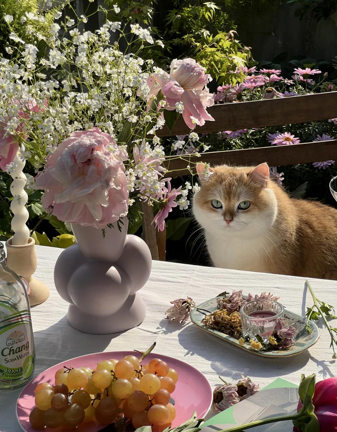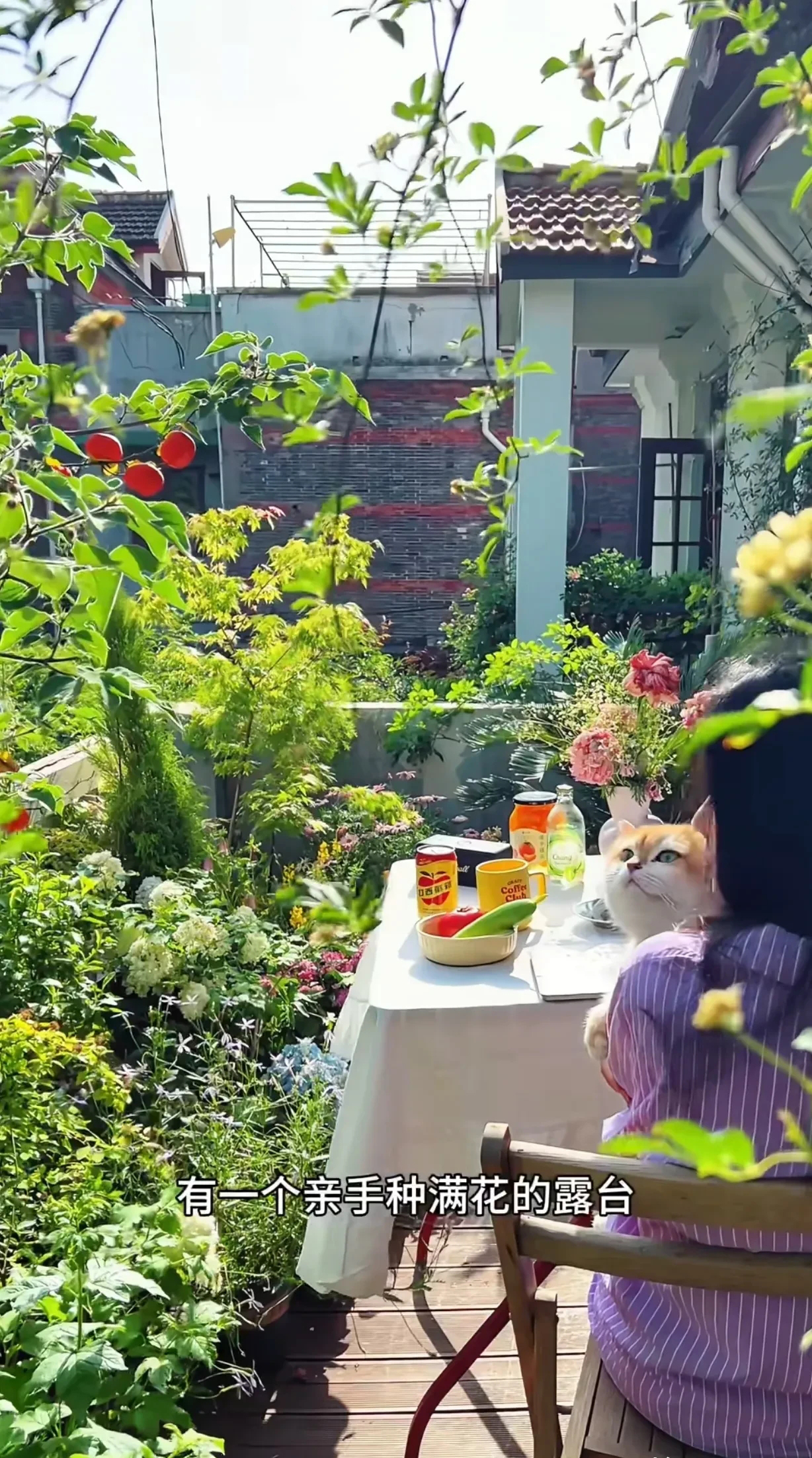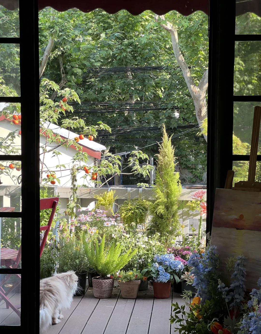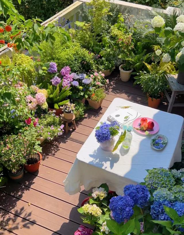 不仅如此,最让人羡慕的是面积约10㎡露台,种植了绣球、狐尾天门冬、长寿花、飞燕草、矮牵牛、月季等,每天被鲜花拥抱的生活,还有猫的陪伴,谁能不爱。