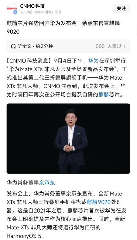 芯片从哪来、良率多少、有没有美系IP,官方一句没提。可以确定的是,发布会结束当晚,华为官网悄悄把Mate XTs的商品页上线,处理器一栏写着“麒麟9020”,其余留空。