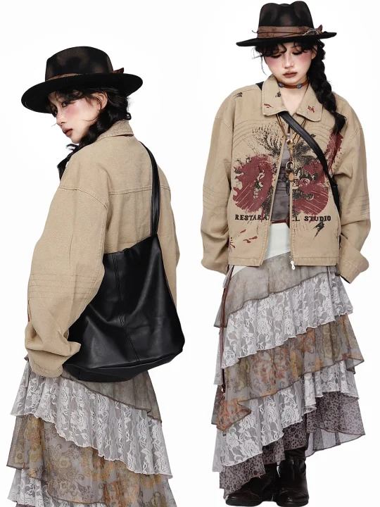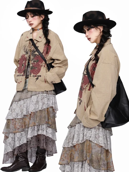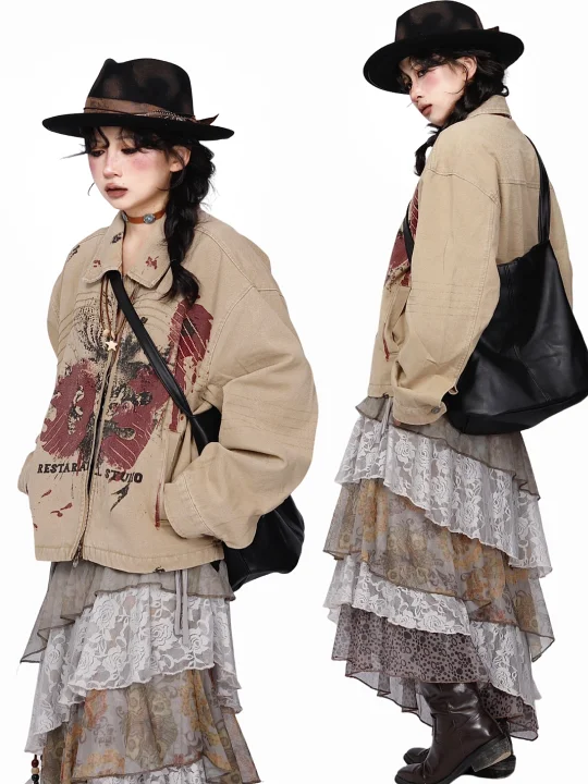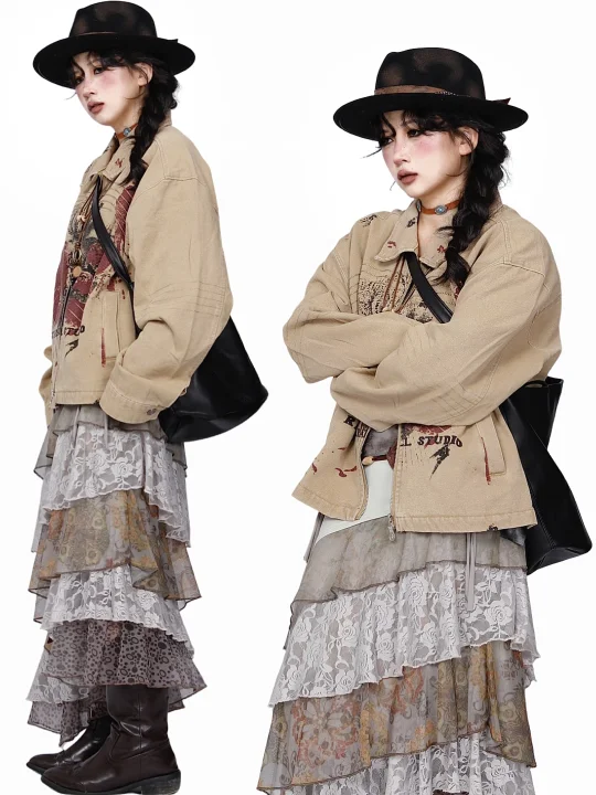 美式复古工装look📜摇滚风夹克✖️多层蕾丝裙
