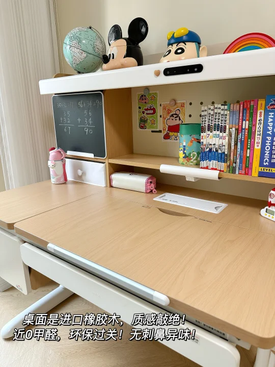 进口橡胶木桌面,接近0甲醛,打开一点味道都没有❌,孩子每天都要趴桌上好久,材质这块必须干净。