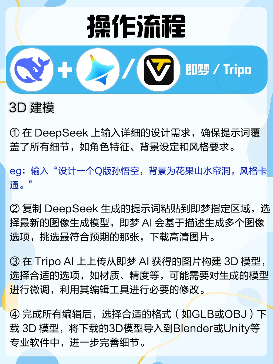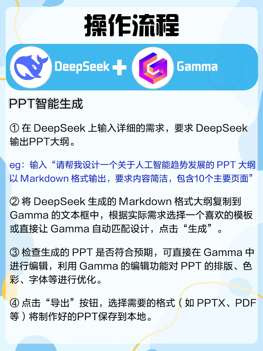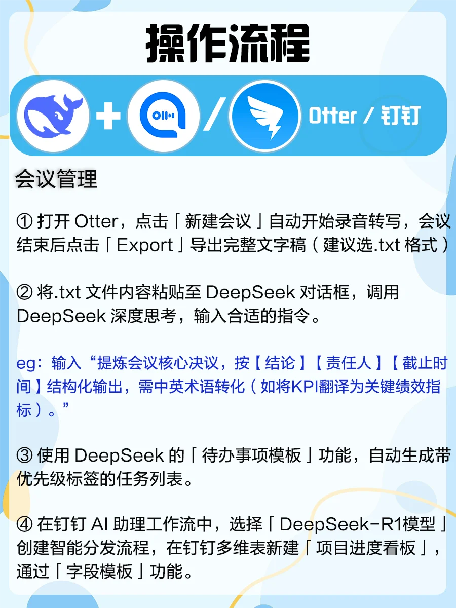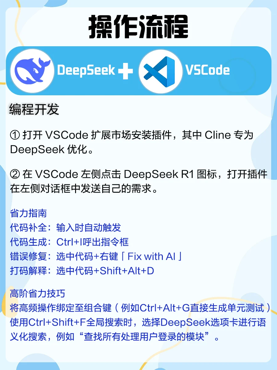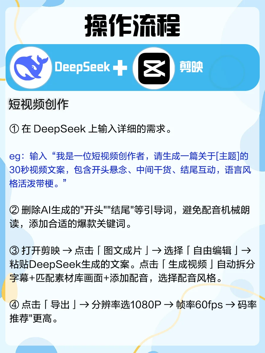 大家在使用DeepSeek一段时间后,会发现其在深度思考方面确实表现不错~[赞R]不过只用DeepSeek单刷“副本”还远远不够,解锁这些隐藏组合技才叫真·赛博开挂[斜眼R],真正发挥1+1>2的水平! 图附详细操作流程,今天手把手教你把1个AI掰成5个肝👇 1️⃣DeepSeek+Gamma➡️PPT智能生成 2️⃣DeepSeek+剪映➡️短视频创作 3️⃣DeepSeek+VSCode➡️编程开发 4️⃣DeepSeek+即梦+Tripo➡️3D建模 5️⃣DeepSeek+Otter+钉钉➡️会议管理 组合技用得好=带薪追剧不是梦,评论区留下你想了解的DeepSeek组合,一起薅秃AI羊毛[派对R][派对R][派对R] deepseek  deepseek教程  deepseek指令  即梦  钉钉  剪映  效率神器
