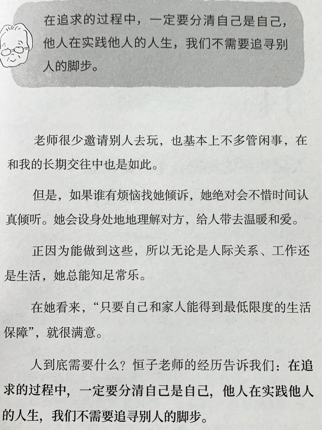 恒子奶奶说,其实,不管是金钱,还是生活方式,对自己来说适度便好。了解自己,接纳自己,把重要的事情作为中心,然后一步一步积极行动。