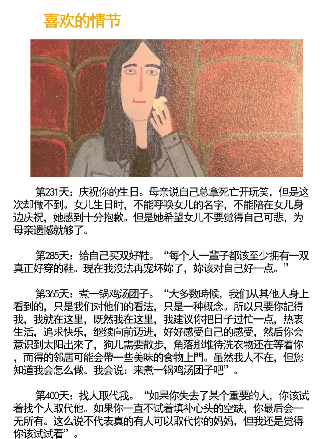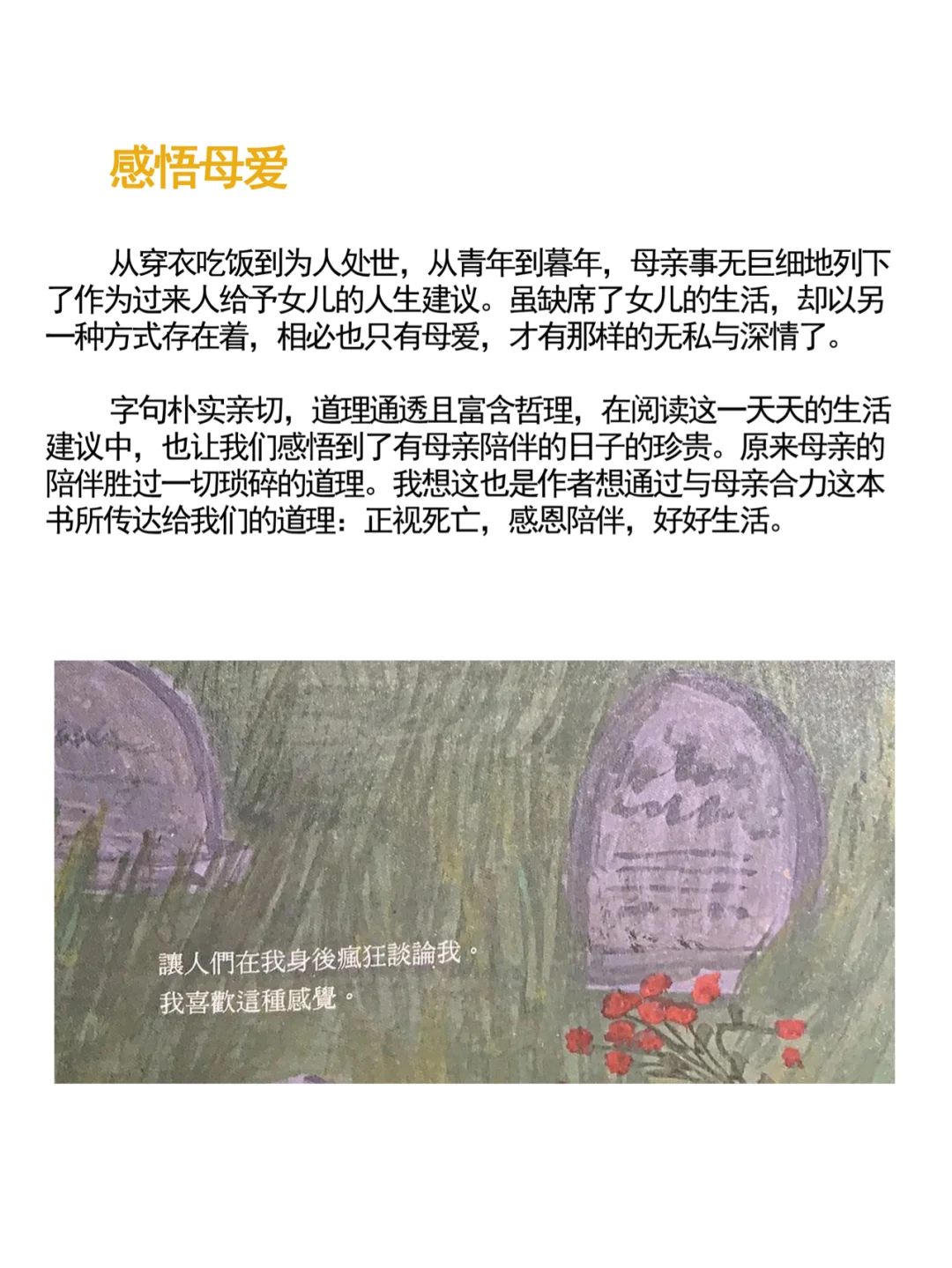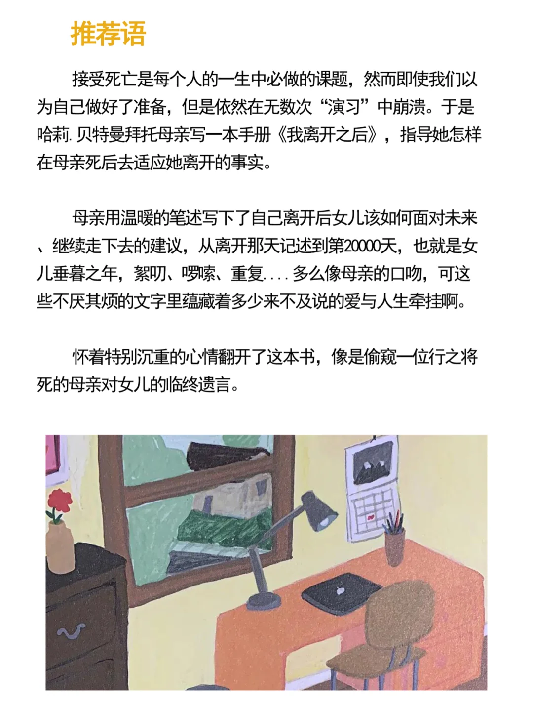 接受死亡是每个人的一生中必做的课题,然而即使我们以为自己做好了准备,但是依然在无数次“演习”中崩溃。于是哈莉.贝特曼拜托母亲写一本手册《我离开之后》,指导她怎样在母亲死后去适应她离开的事实。 母亲用温暖的笔述写下了自己离开后女儿该如何面对未来、继续走下去的建议,从离开那天记述到第20000天,也就是女儿垂暮之年,絮叨、啰嗦、重复....多么像母亲的口吻,可这些不厌其烦的文字里蕴藏着多少来不及说的爱与人生牵挂啊。 怀着特别沉重的心情翻开了这本书,像是偷窥一位行之将死的母亲对女儿的临终遗言。