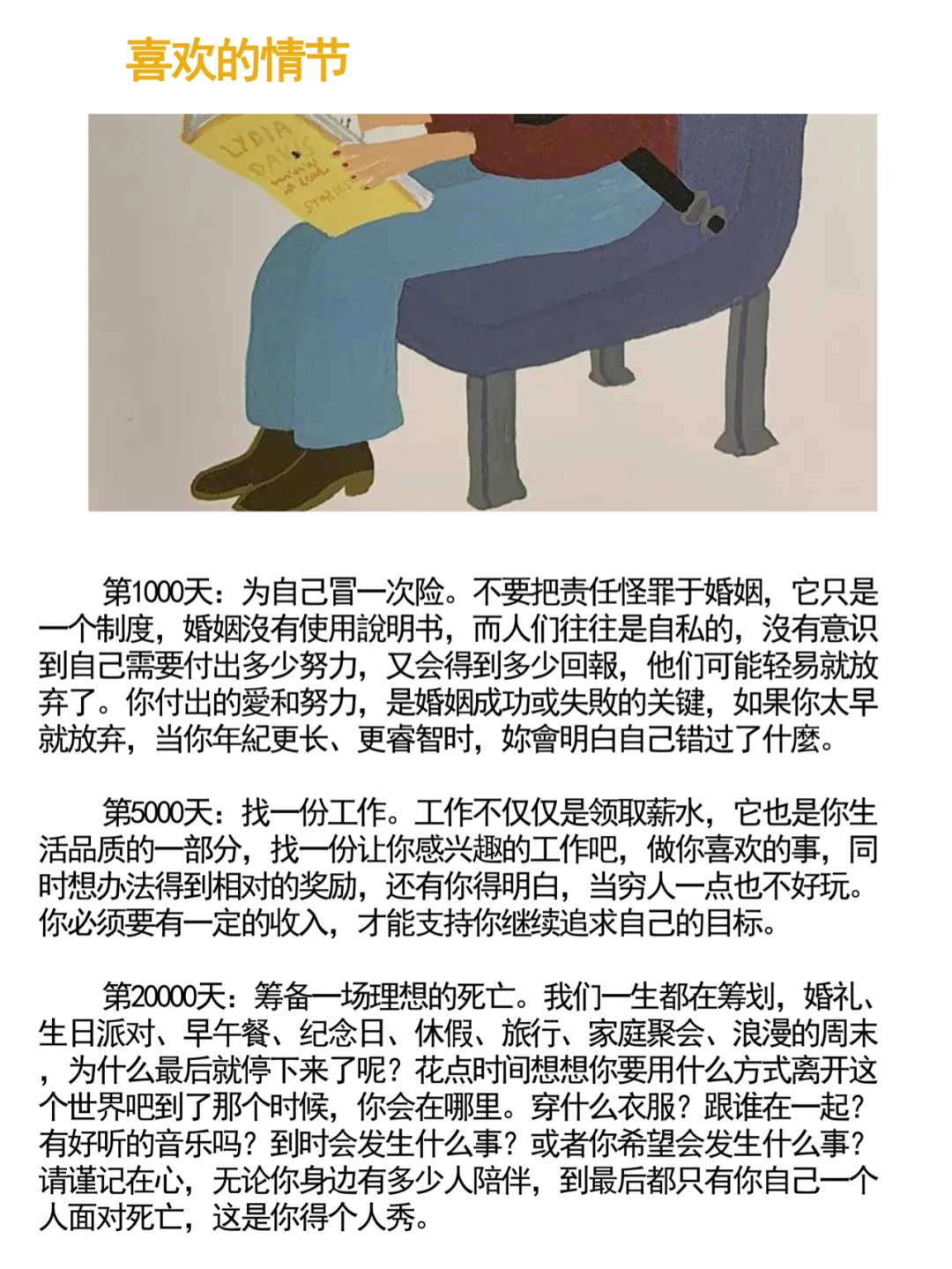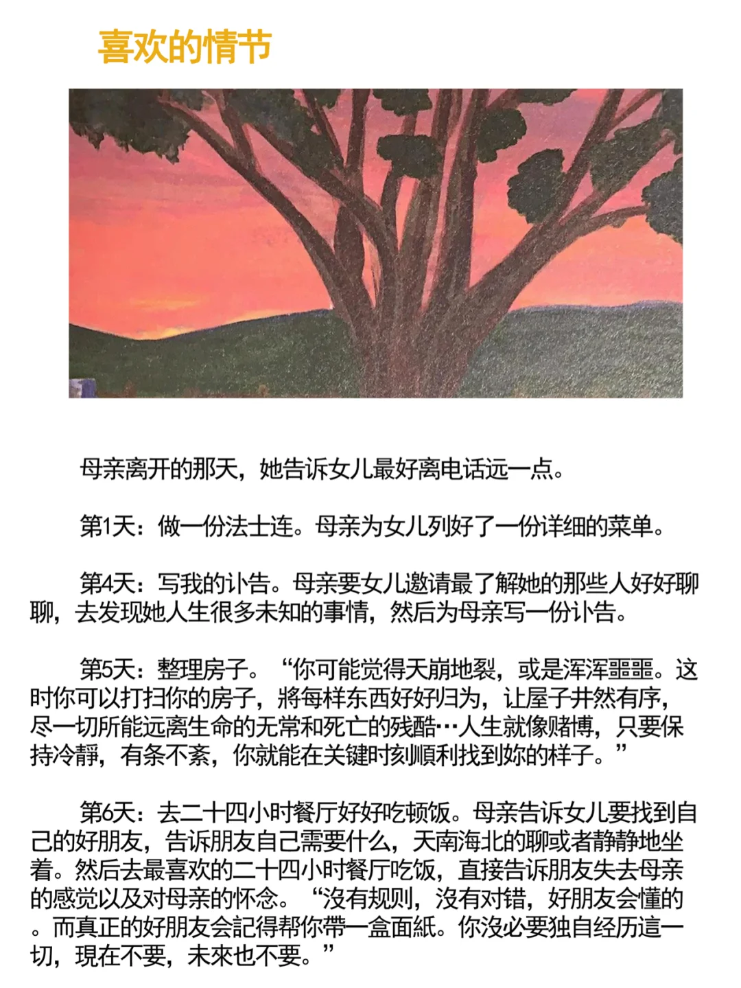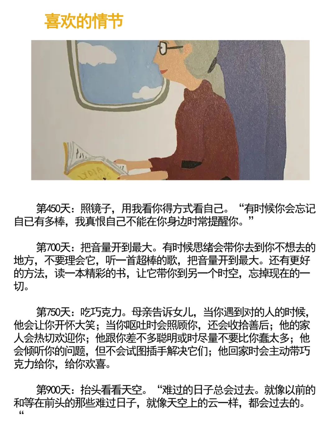 接受死亡是每个人的一生中必做的课题,然而即使我们以为自己做好了准备,但是依然在无数次“演习”中崩溃。于是哈莉.贝特曼拜托母亲写一本手册《我离开之后》,指导她怎样在母亲死后去适应她离开的事实。 母亲用温暖的笔述写下了自己离开后女儿该如何面对未来、继续走下去的建议,从离开那天记述到第20000天,也就是女儿垂暮之年,絮叨、啰嗦、重复....多么像母亲的口吻,可这些不厌其烦的文字里蕴藏着多少来不及说的爱与人生牵挂啊。 怀着特别沉重的心情翻开了这本书,像是偷窥一位行之将死的母亲对女儿的临终遗言。