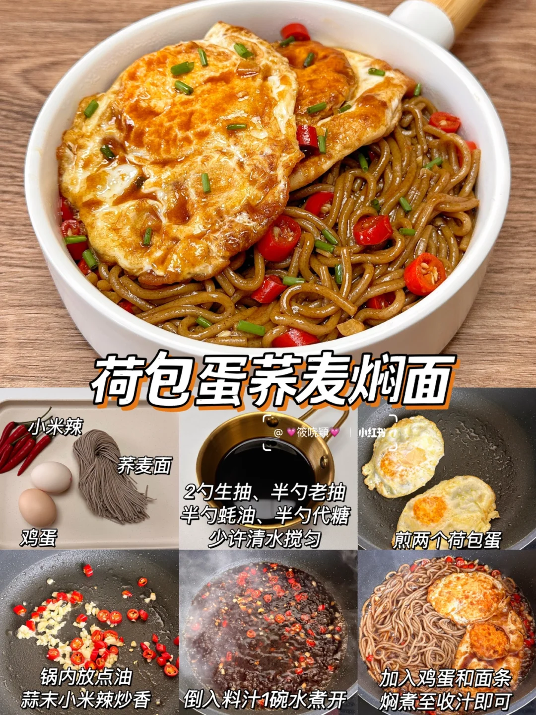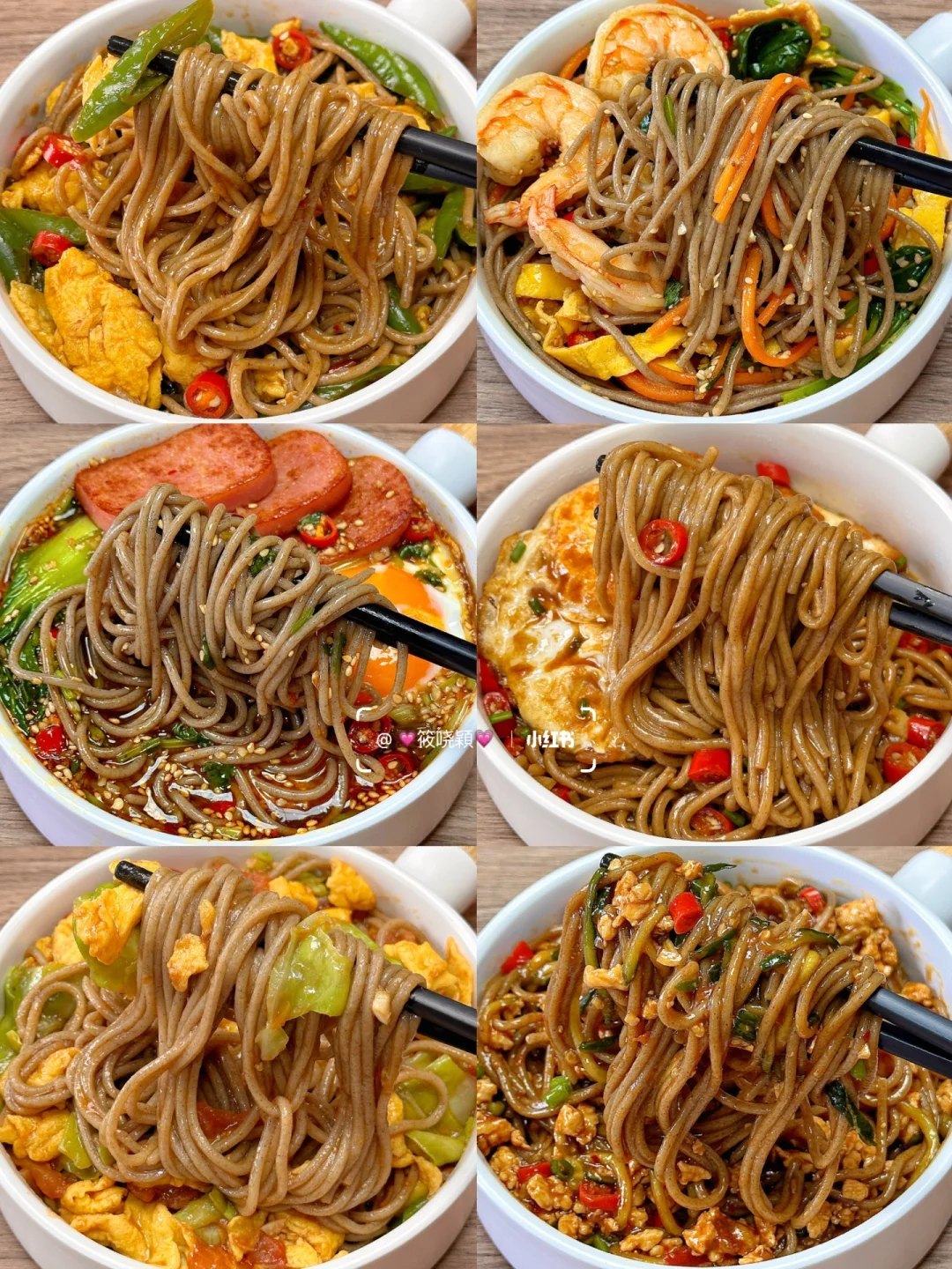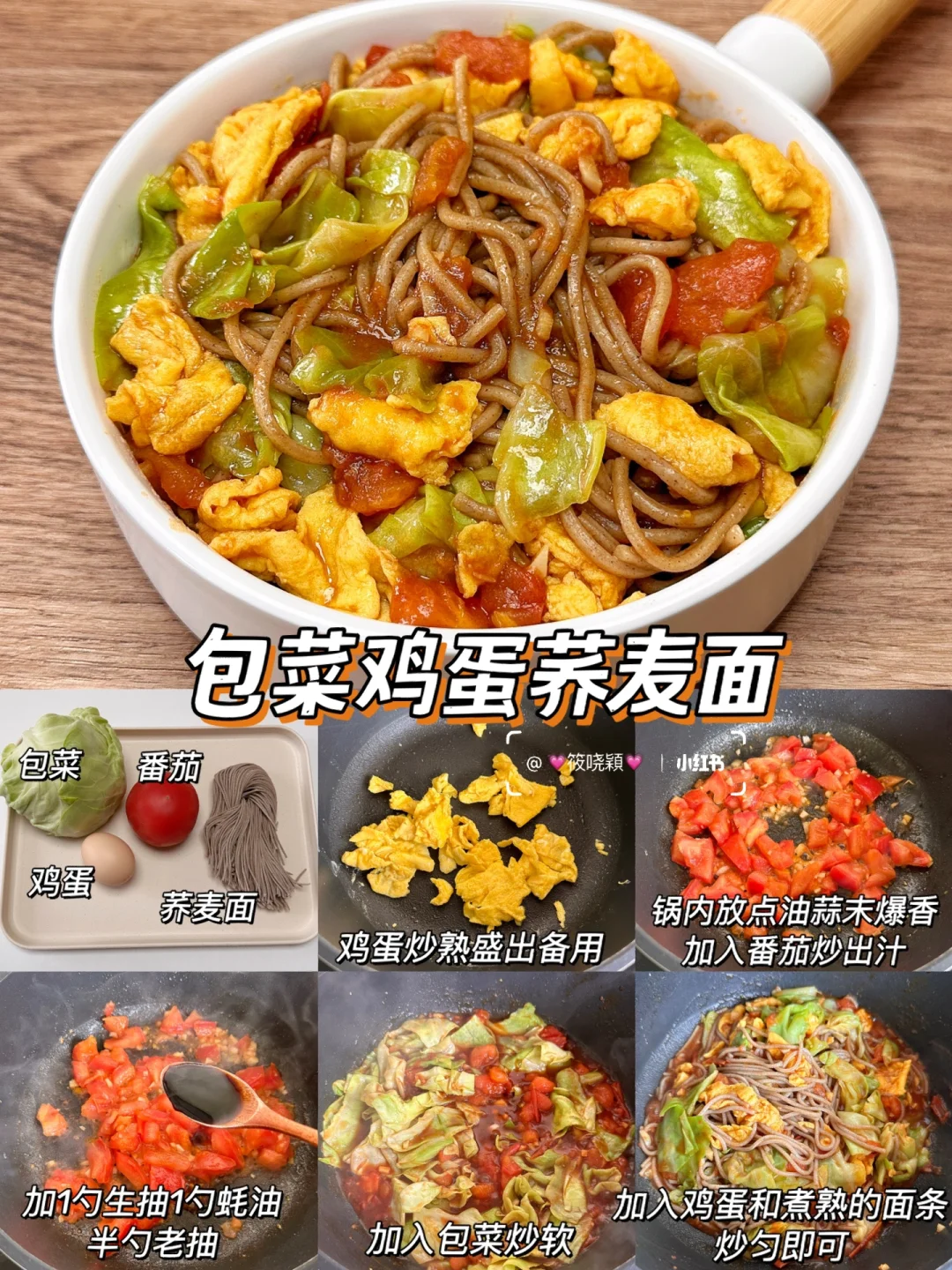 ✅荞麦面煮熟捞出过凉水,鸡蛋炒熟备用,蒜末爆香加番茄炒出汁,加1勺生抽1勺蚝油半勺老抽,加入包菜炒软,放入面条和鸡蛋炒匀即可