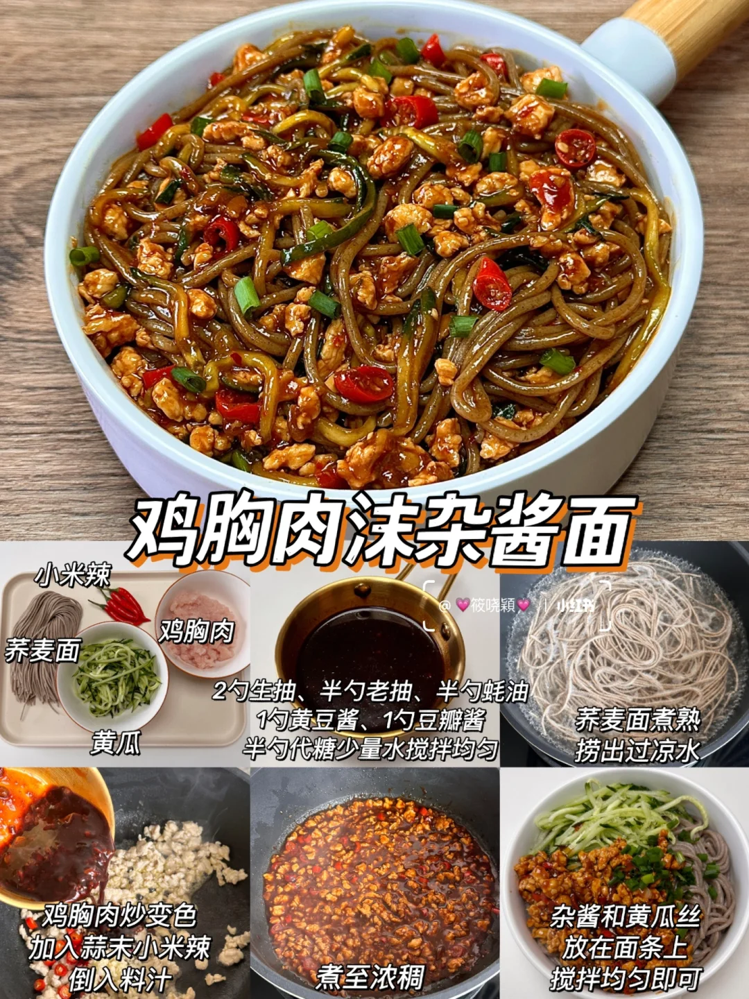 锅内喷油,倒入鸡胸肉炒变色,放蒜末小米辣,倒入料汁煮至浓稠,荞麦面煮熟捞出,铺上黄瓜丝和杂酱拌匀开吃
