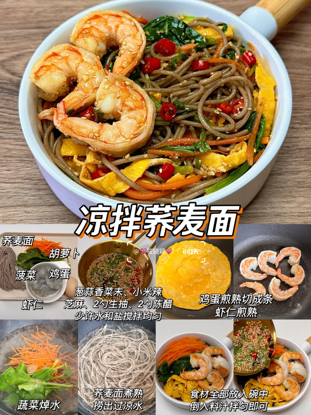 鸡蛋打散煎熟切成丝,虾仁煎熟,荞麦面煮熟捞出过凉水,食材依次放入,淋入料汁即可