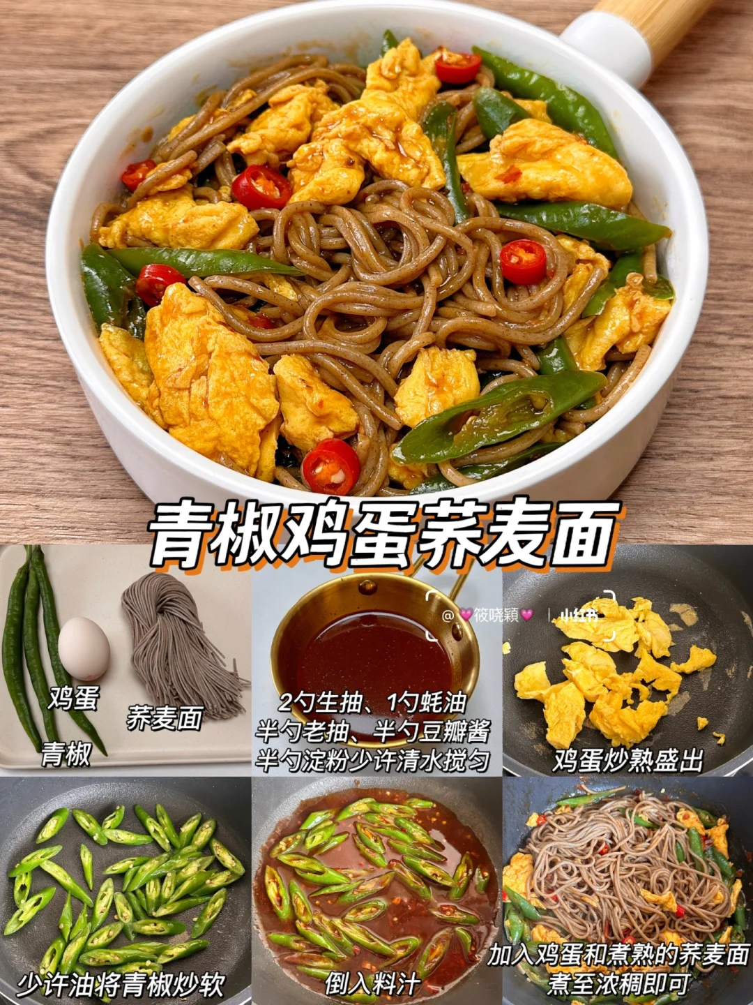 鸡蛋炒熟盛出,少许油将青椒炒软,倒入料汁,放入鸡蛋和煮熟的荞麦面,煮至浓稠