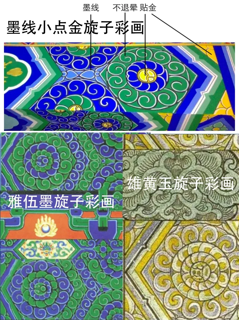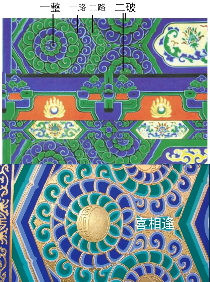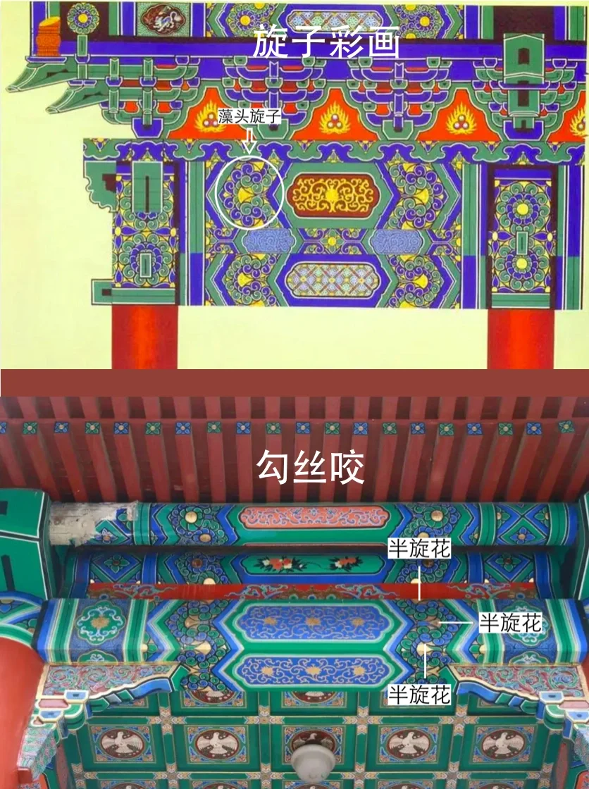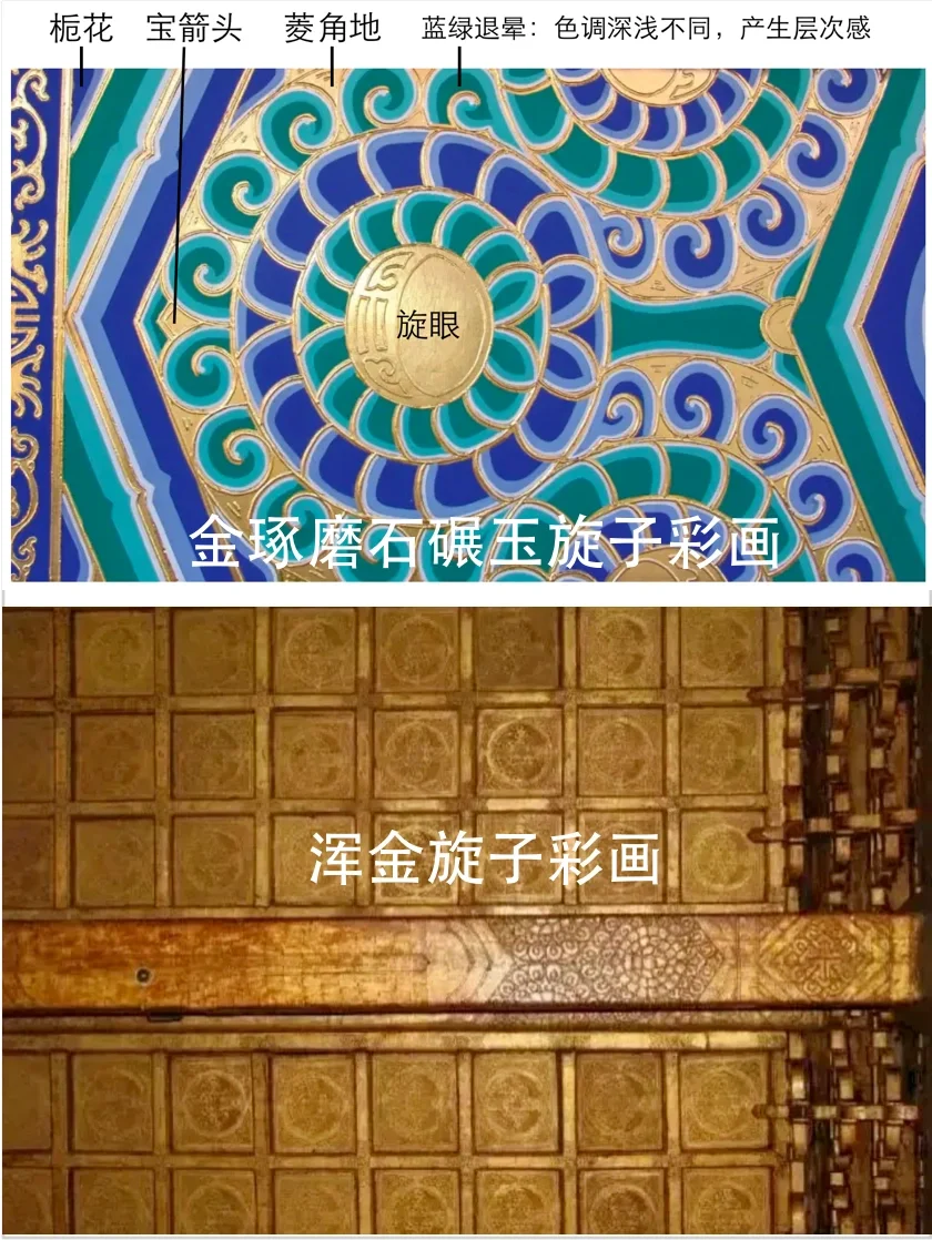 逛故宫,一定要抬头看。今天久要带大家了解一个,你极易忽略的绝美梁枋装饰—彩画。 🌟清式彩画分三类,第一类是和玺彩画,等级最高。枋心、藻头(位置如图示)均有龙的,叫🎖金龙和玺彩画,所在建筑地位至上,是皇帝登基、理政、居住的地方。 ☀️枋心、藻头有龙、凤的,叫龙凤和玺彩画,地位次之,为帝后寝宫。 💚枋心、藻头有龙、草的,叫龙草和玺彩画,常被用于一些配殿。 🌟第二类为旋子彩画,主要特征是藻头为旋子,它的等级低于和玺彩画。 旋子由旋花组成,表现样式很多。3个「半旋花」组成的样式叫勾丝咬。 一个旋花(整)和两个「半旋花」(破)组成的样式,叫一整二破。 一个旋花与两个「半旋花」之间,多一组花瓣的,叫一整二破加一路。多两组花瓣的,叫一整二破加二路。 一个旋花和两个「半旋花」最外侧花瓣相较的,叫喜相逢。 旋子彩画被分为九个等级,我们按以下三个方面做区分 1 金线:等级高,墨线:等级低 2 退晕:等级高,不退晕:等级低 退晕为不同深浅的颜色组合产生的层次感。 3 旋眼、菱角地、宝箭头、栀花(位置如图)贴金:等级高,不贴金:等级低 🎖1 浑金旋子彩画:全贴金 ☀️2 金琢墨石碾玉旋子彩画:轮廓金线,花瓣退晕,旋眼、菱角地、宝箭头、栀花贴金 💚3 烟琢墨石碾玉旋子彩画:主体金线,旋花墨线,花瓣退晕,旋眼、菱角地、宝箭头、栀花贴金 🔮4 金线大点金旋子彩画:主体线边缘贴金,旋子墨线,花瓣不退晕,旋眼、菱角地、宝箭头、栀花贴金 🌀5 墨线大点金旋子彩画:轮廓墨线,花瓣不退晕,旋眼、菱角地、宝箭头、栀花贴金 💙6 金线小点金旋子彩:主体线边缘贴金,旋子墨线,花瓣不退晕,旋眼、栀花贴金 🔺7 墨线小点金旋子彩画:轮廓墨线,花瓣不退晕,旋眼、栀花贴金 🔸8 雅伍墨旋子彩画:不贴金 ▫️9 雄黄玉旋子彩画:黄色为主,颜料中有雄黄 🌟除了和玺彩画和玄子彩画,第三类苏式彩画,等级最低,枋心多为山水、花鸟、人物等内容,常见于园林中。 🎖金琢墨苏画是最华丽的一种。 ☀️金线苏画则最为常见,画中所有线均贴金。 💚黄/墨线苏画不贴金,轮廓用黄线或墨线勾勒。 🔮海墁苏画没有枋心,只保留箍头,画一些简单的花纹,多用于建筑的次要部位。