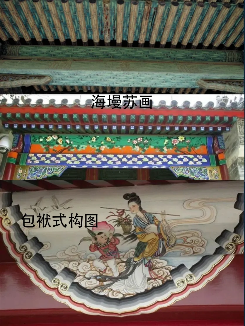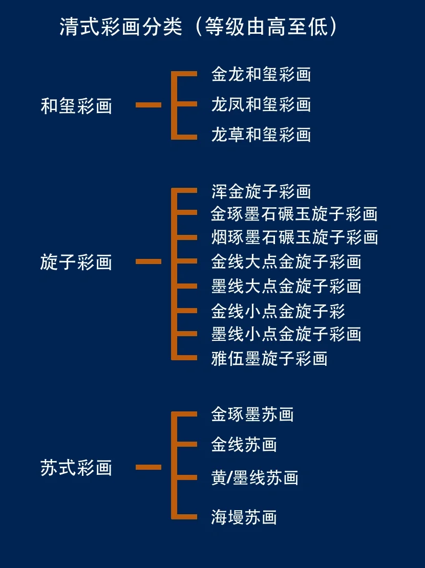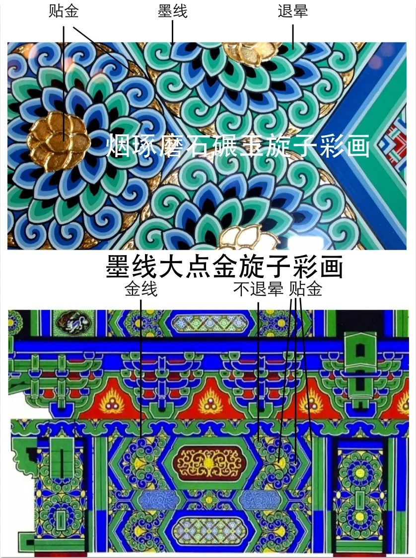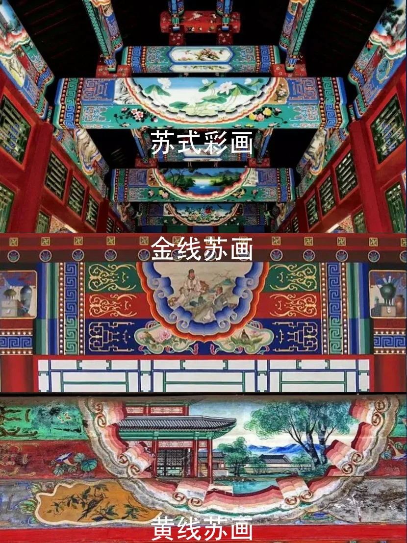 逛故宫,一定要抬头看。今天久要带大家了解一个,你极易忽略的绝美梁枋装饰—彩画。 🌟清式彩画分三类,第一类是和玺彩画,等级最高。枋心、藻头(位置如图示)均有龙的,叫🎖金龙和玺彩画,所在建筑地位至上,是皇帝登基、理政、居住的地方。 ☀️枋心、藻头有龙、凤的,叫龙凤和玺彩画,地位次之,为帝后寝宫。 💚枋心、藻头有龙、草的,叫龙草和玺彩画,常被用于一些配殿。 🌟第二类为旋子彩画,主要特征是藻头为旋子,它的等级低于和玺彩画。 旋子由旋花组成,表现样式很多。3个「半旋花」组成的样式叫勾丝咬。 一个旋花(整)和两个「半旋花」(破)组成的样式,叫一整二破。 一个旋花与两个「半旋花」之间,多一组花瓣的,叫一整二破加一路。多两组花瓣的,叫一整二破加二路。 一个旋花和两个「半旋花」最外侧花瓣相较的,叫喜相逢。 旋子彩画被分为九个等级,我们按以下三个方面做区分 1 金线:等级高,墨线:等级低 2 退晕:等级高,不退晕:等级低 退晕为不同深浅的颜色组合产生的层次感。 3 旋眼、菱角地、宝箭头、栀花(位置如图)贴金:等级高,不贴金:等级低 🎖1 浑金旋子彩画:全贴金 ☀️2 金琢墨石碾玉旋子彩画:轮廓金线,花瓣退晕,旋眼、菱角地、宝箭头、栀花贴金 💚3 烟琢墨石碾玉旋子彩画:主体金线,旋花墨线,花瓣退晕,旋眼、菱角地、宝箭头、栀花贴金 🔮4 金线大点金旋子彩画:主体线边缘贴金,旋子墨线,花瓣不退晕,旋眼、菱角地、宝箭头、栀花贴金 🌀5 墨线大点金旋子彩画:轮廓墨线,花瓣不退晕,旋眼、菱角地、宝箭头、栀花贴金 💙6 金线小点金旋子彩:主体线边缘贴金,旋子墨线,花瓣不退晕,旋眼、栀花贴金 🔺7 墨线小点金旋子彩画:轮廓墨线,花瓣不退晕,旋眼、栀花贴金 🔸8 雅伍墨旋子彩画:不贴金 ▫️9 雄黄玉旋子彩画:黄色为主,颜料中有雄黄 🌟除了和玺彩画和玄子彩画,第三类苏式彩画,等级最低,枋心多为山水、花鸟、人物等内容,常见于园林中。 🎖金琢墨苏画是最华丽的一种。 ☀️金线苏画则最为常见,画中所有线均贴金。 💚黄/墨线苏画不贴金,轮廓用黄线或墨线勾勒。 🔮海墁苏画没有枋心,只保留箍头,画一些简单的花纹,多用于建筑的次要部位。