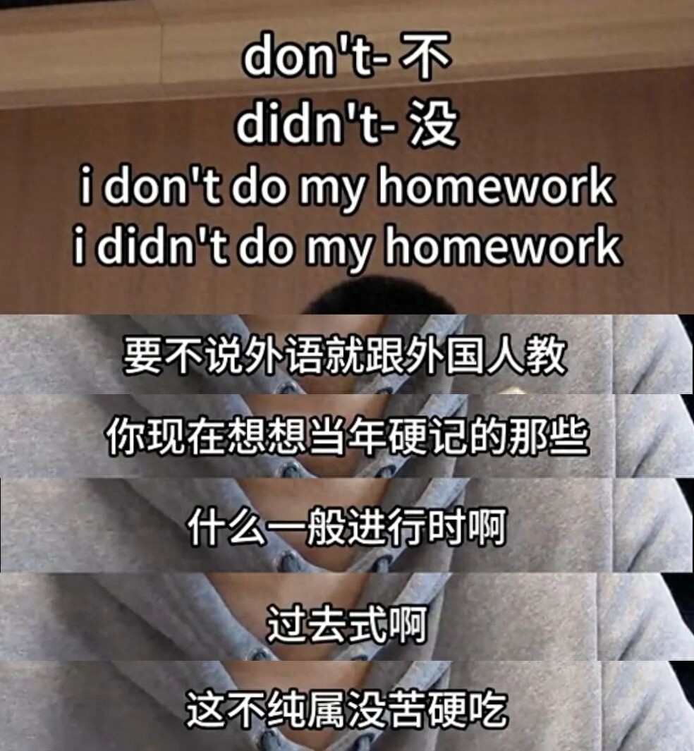 小孩哥原本的回答是:一个是一般现在时,一个是一般过去时。结果立刻遭到外教“零帧起手”式否决,对方说:don’t 是“不”,didn’t 是“没”。