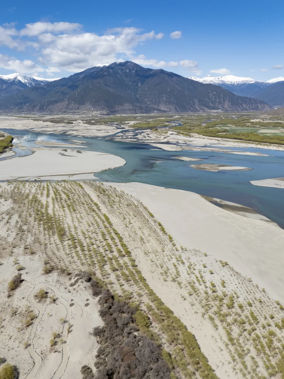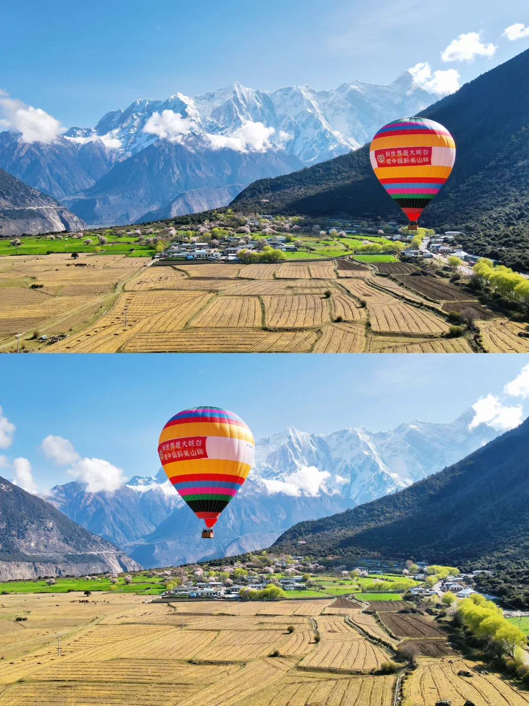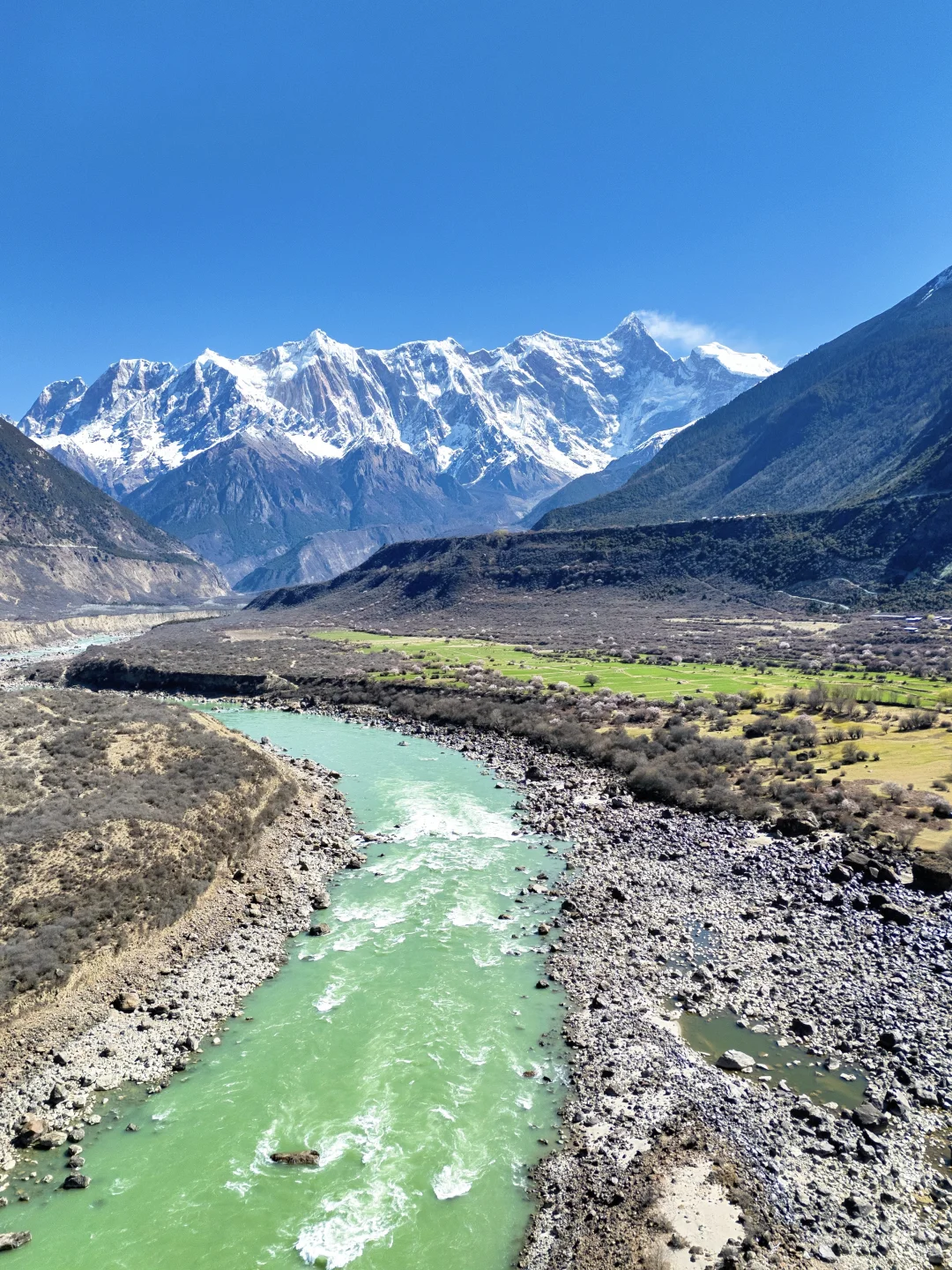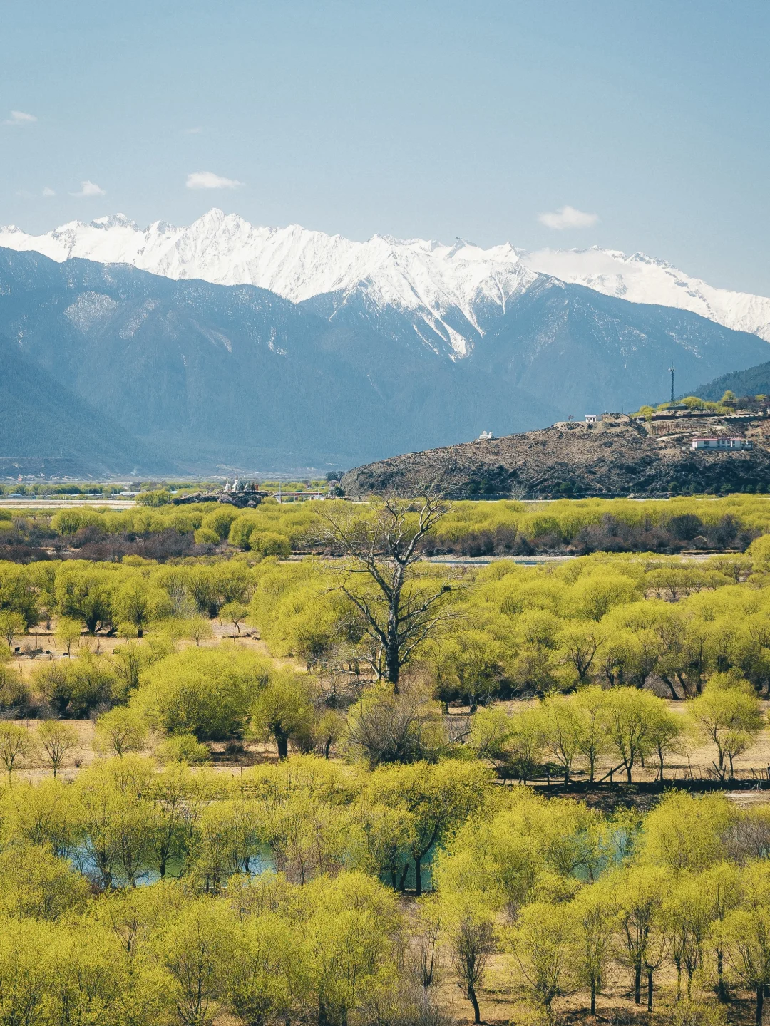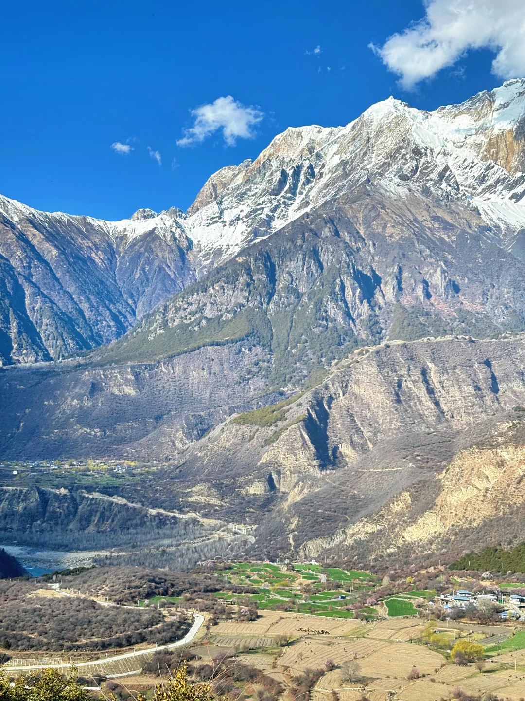 蓝天白云、江水碧绿江水、粉粉的桃花照应着皑皑雪山,说是人间仙境也不过如此吧😭