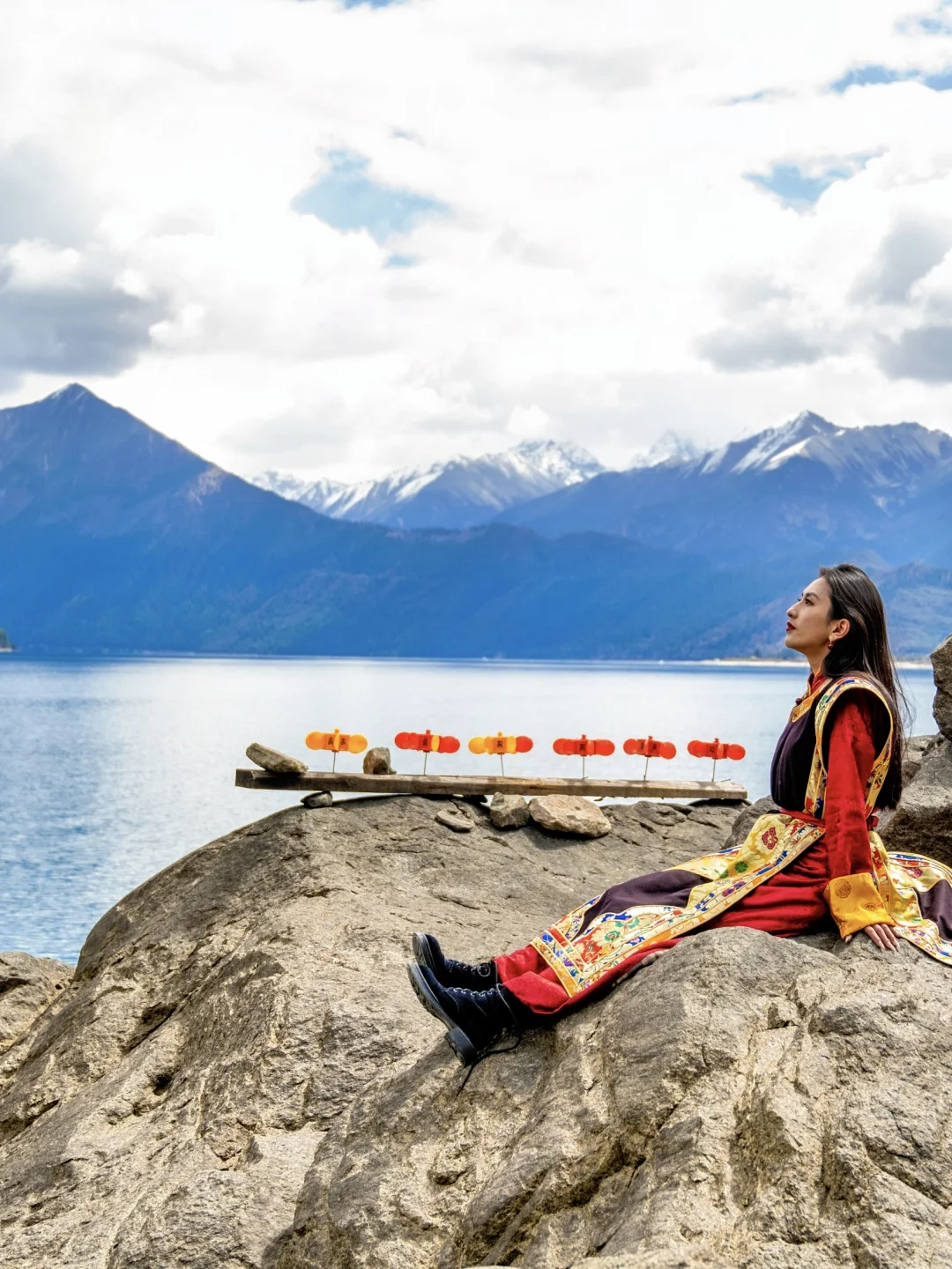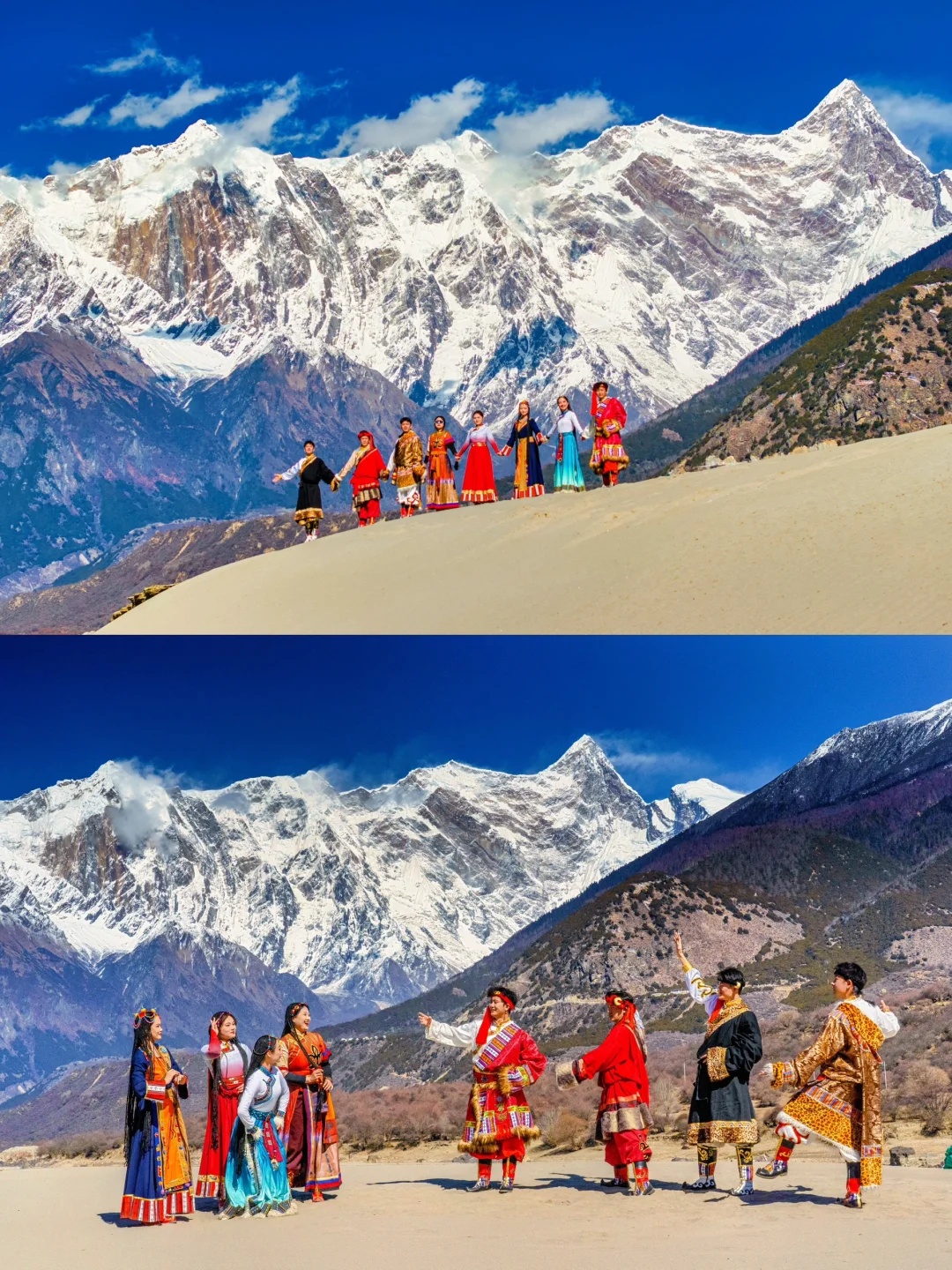 身穿藏装,在桃花与雪山的映衬下拍照超有氛围。还可以在挂满经幡的山口撒隆达祈福,体验西藏独特的文化;