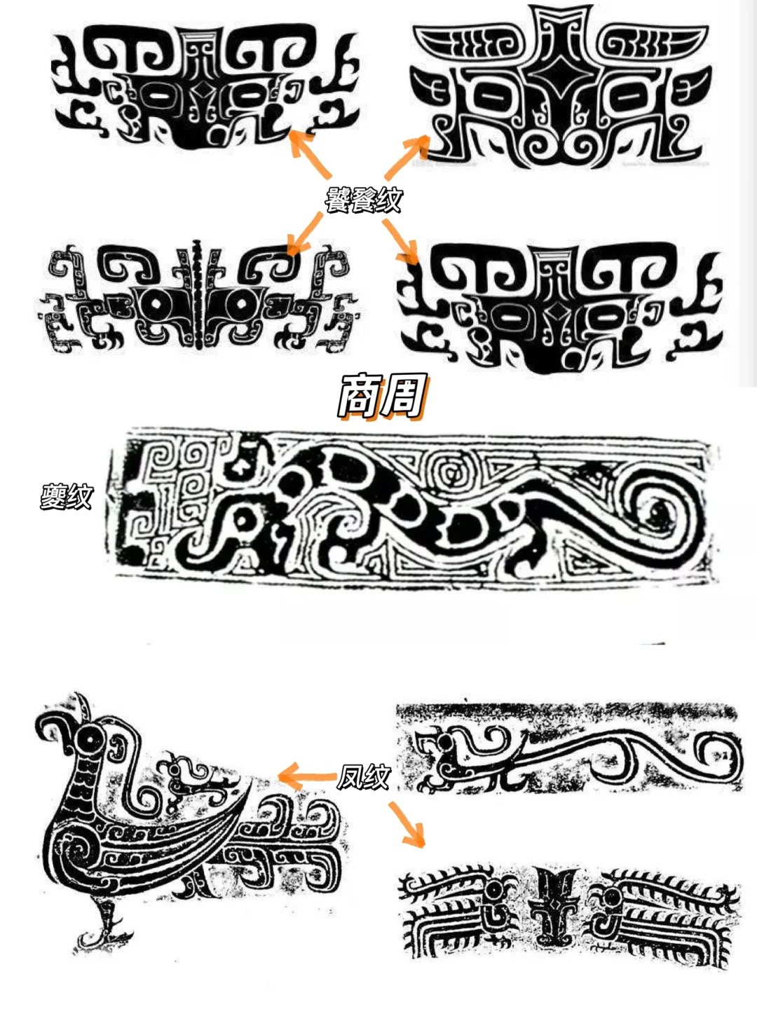 🐲商周时期,青铜礼器刻有动物图腾,以承载沟通天地的使命,整体形制神秘庄重。饕餮纹始于天极神和两条龙,夔纹也是传说中的龙形异兽,龙凤纹更不必说,都是古时的祥瑞象征。