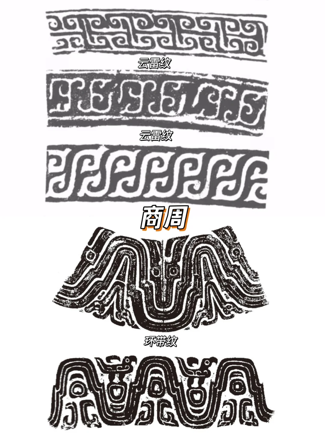 几何纹通常作为配饰存在,由方、圆两种形状组成的云雷纹使用最广,其次是鱼鳞纹、圆点纹以及形如山云的环带纹。