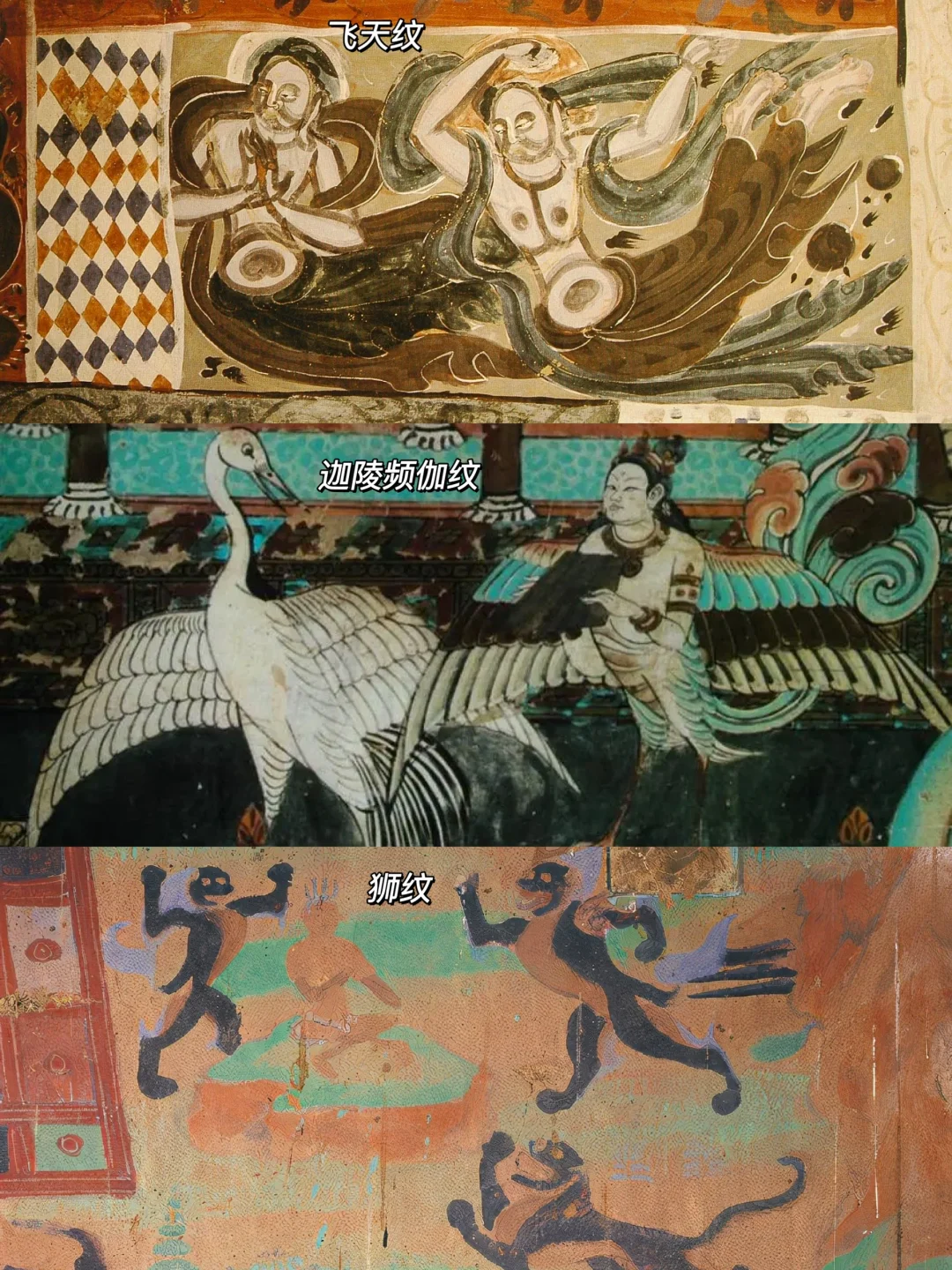这一时期,佛教兴盛,在敦煌壁画上,我们能看到体现佛法永存的🦁狮纹、作为普贤坐骑的🐘象纹,以及佛国神鸟迦陵频伽纹、佛教司乐之神飞天纹等。