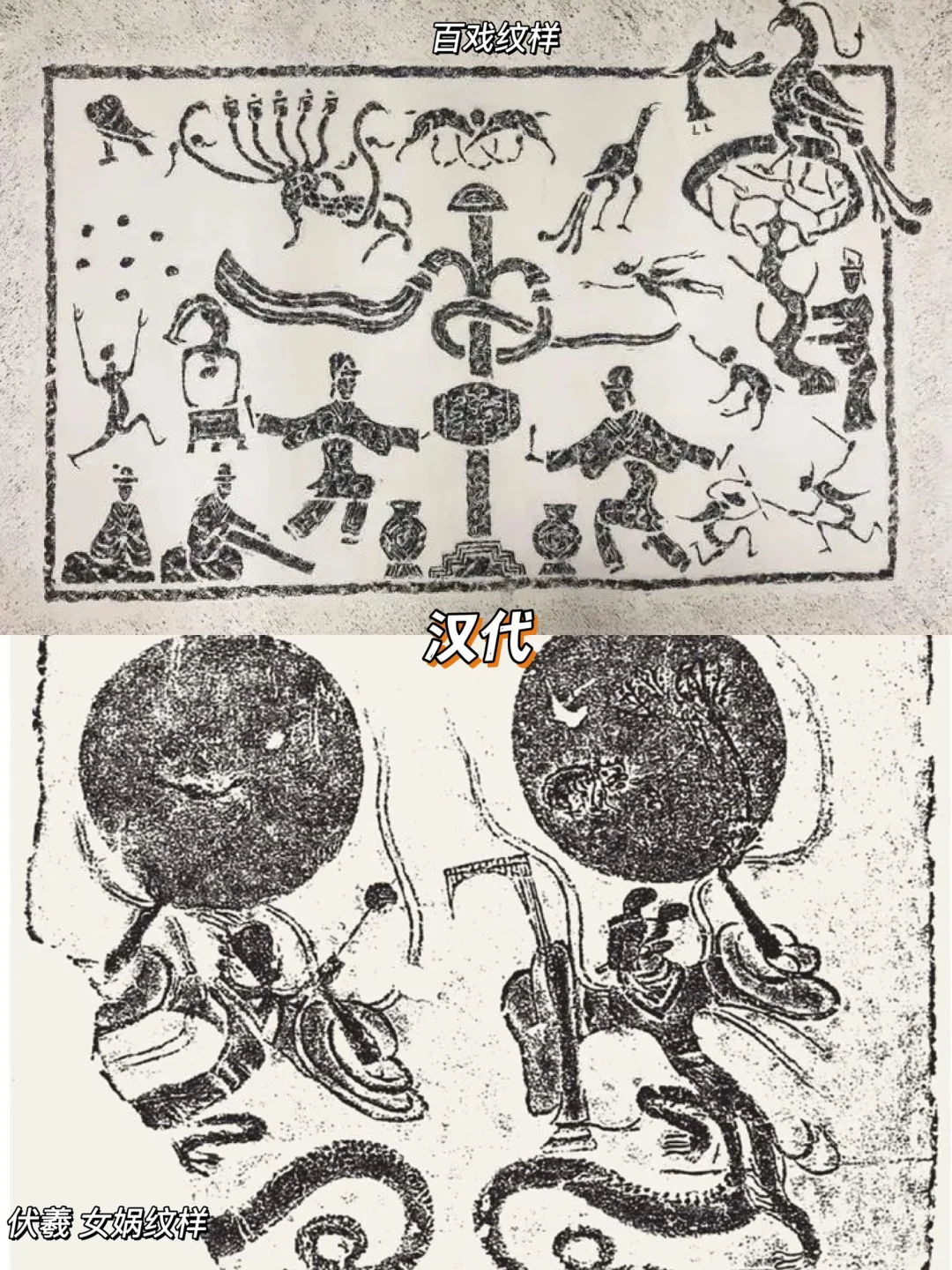 此外,世俗生活里,牛耕、收获、车行、百戏等纹样,丰富多彩;神话传说中,伏羲、女娲、日月神、羽人等形象,也层出不穷。