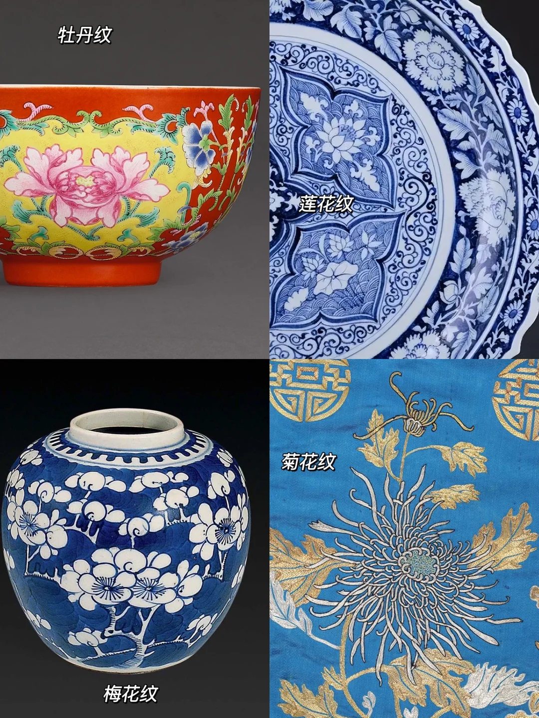 🌺到了宋、元、明、清,瓷器的普及令花纹变得程式化。植物中,牡丹表富贵,莲花意廉洁,梅花表高洁,菊花意长寿,缠枝显生动,为当时的时兴花纹。