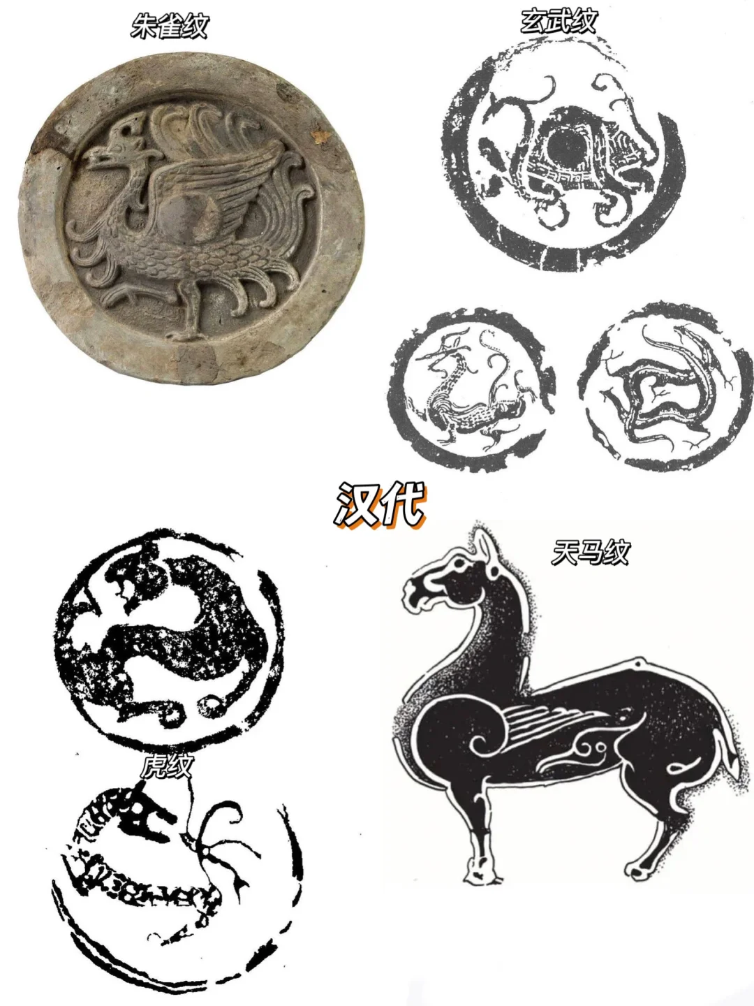 🧱汉朝以砖画为主,马纹、鹿纹体现狩猎盛行;龙纹、虎纹、朱雀纹、玄武纹表露信仰主张。