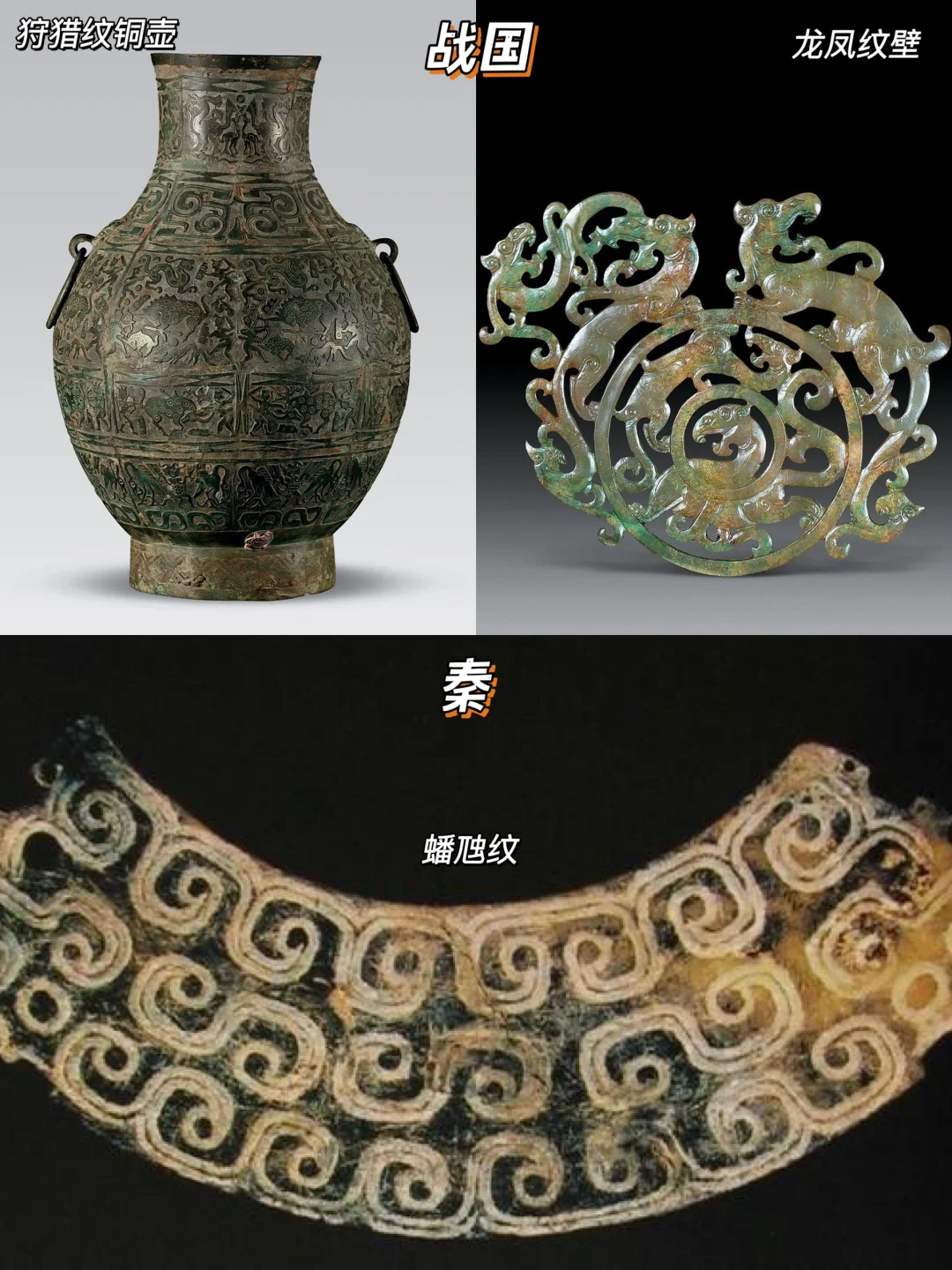 🐍秦朝纹样较为质朴、规整,龙形或蛇形的蟠螭纹、夔纹、虺纹最具代表。