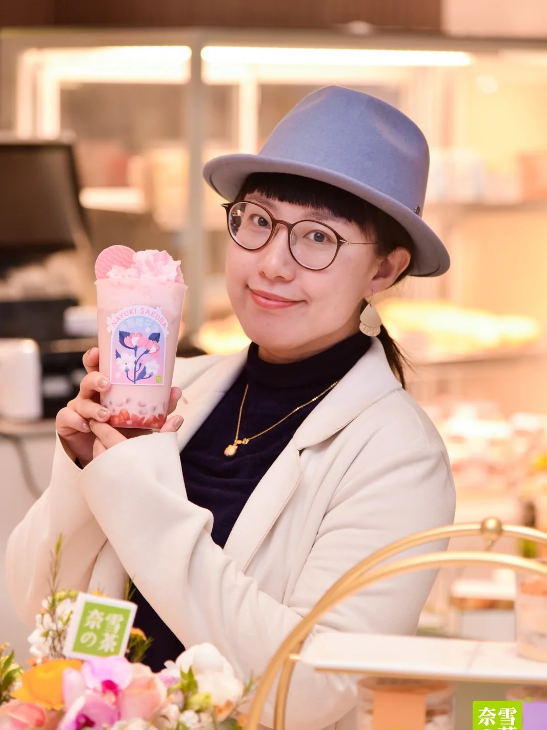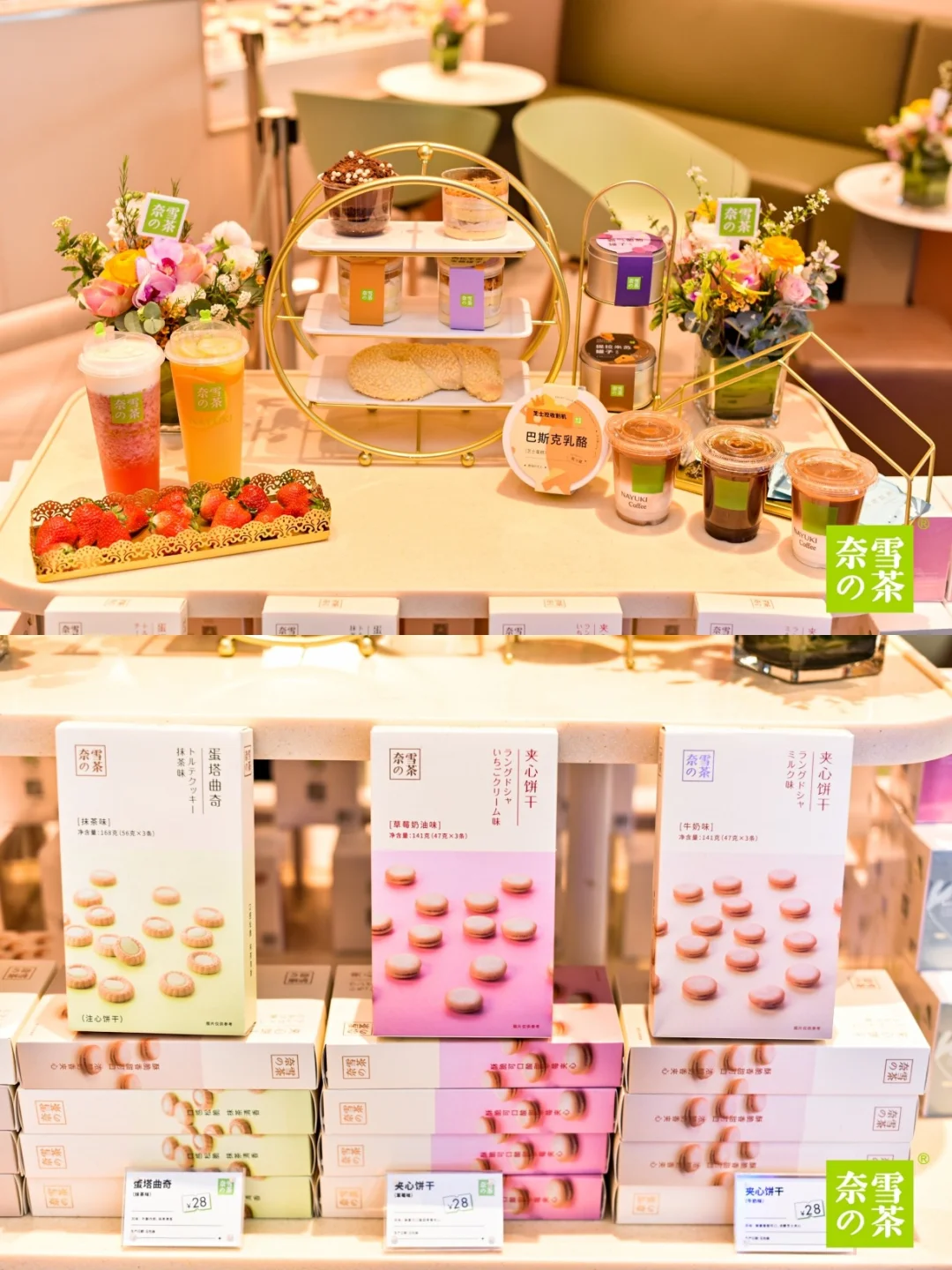 🌸 春日樱花宝藏茶:独家粉色樱花饼干奶油顶!太别致顶粉色樱花饼干啦,拿到手里就觉得樱花烂漫,少女心爆棚!中间层是红颜奶油草莓鲜果加入牛奶黑科技的冰博克鲜牛乳,奶香浓郁,同时加入奈雪茗优茶金观音,底部是香甜的奶油草莓鲜果和爽脆的脆珠珠。