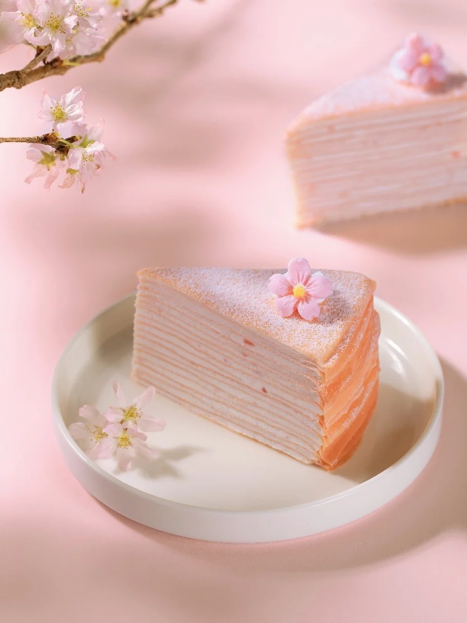 🌸 春日樱花蜜桃千层:柔韧Q弹蛋皮,入口即化的奶油,绵密不腻。
