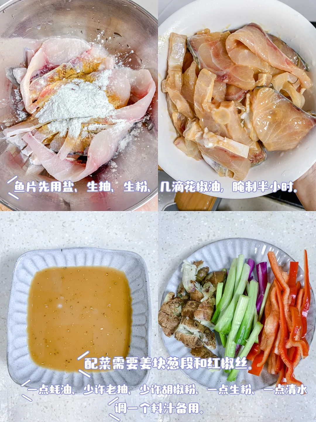 1️⃣、鱼片先用盐、生抽、生粉、几滴花椒油腌制(一定要加花椒油、一定要加花椒油、一定要加花椒油)
