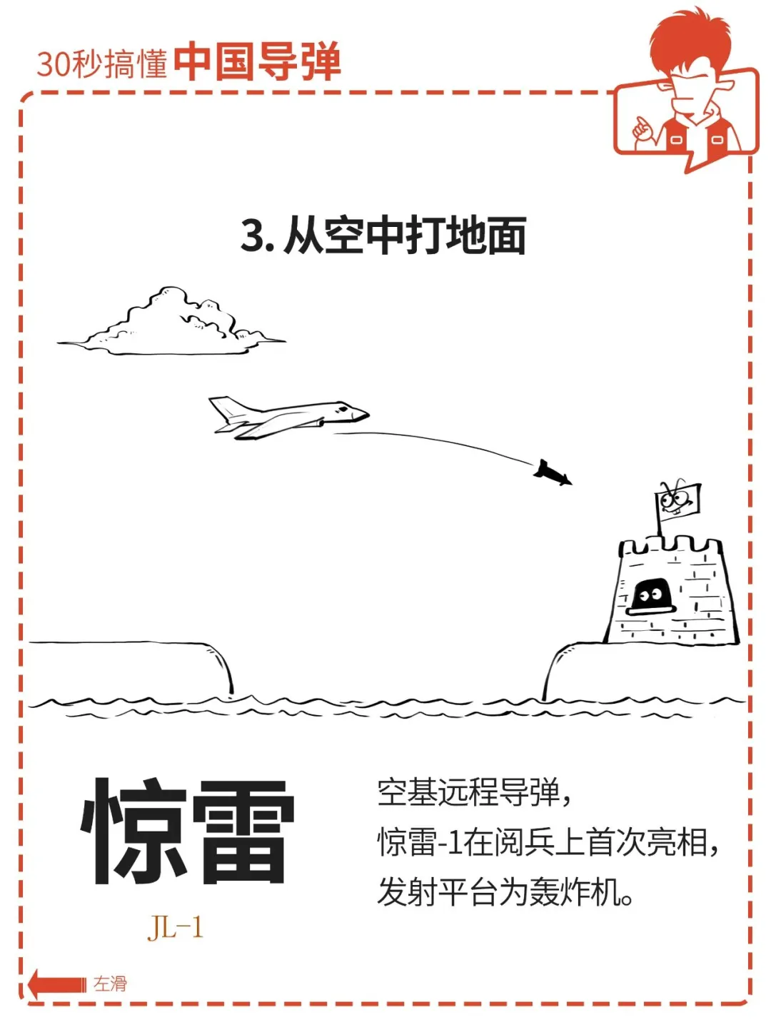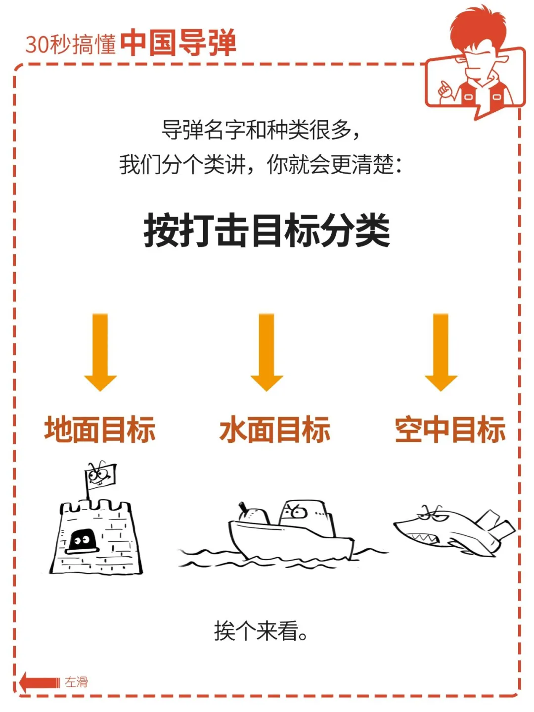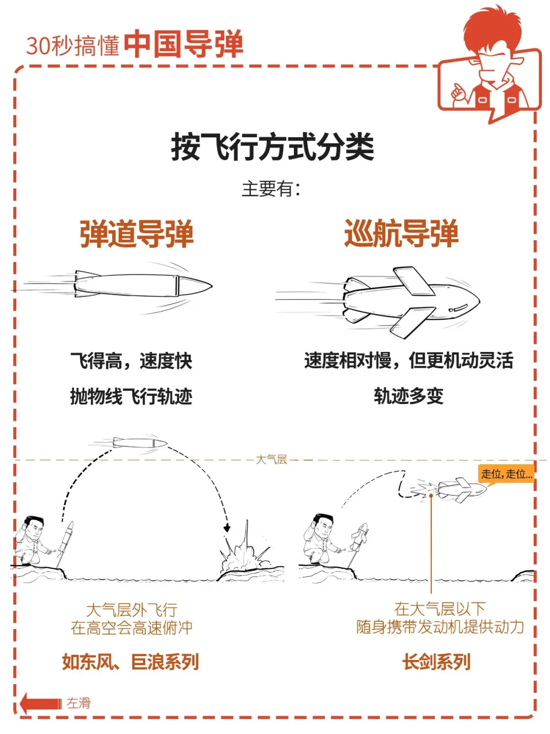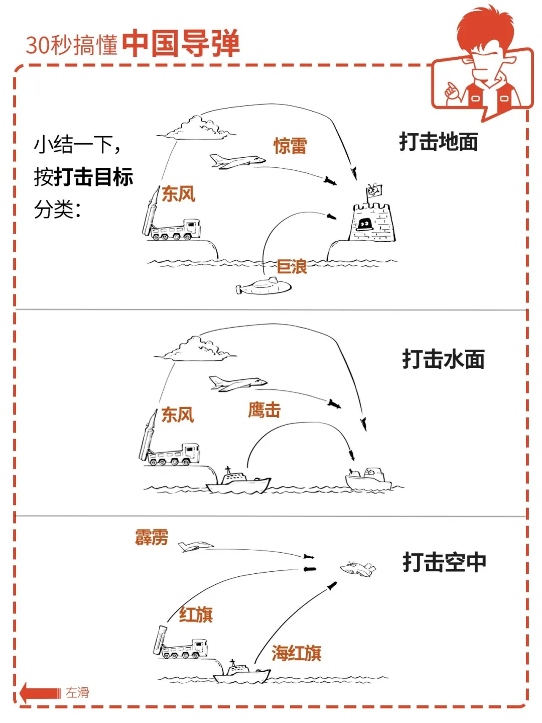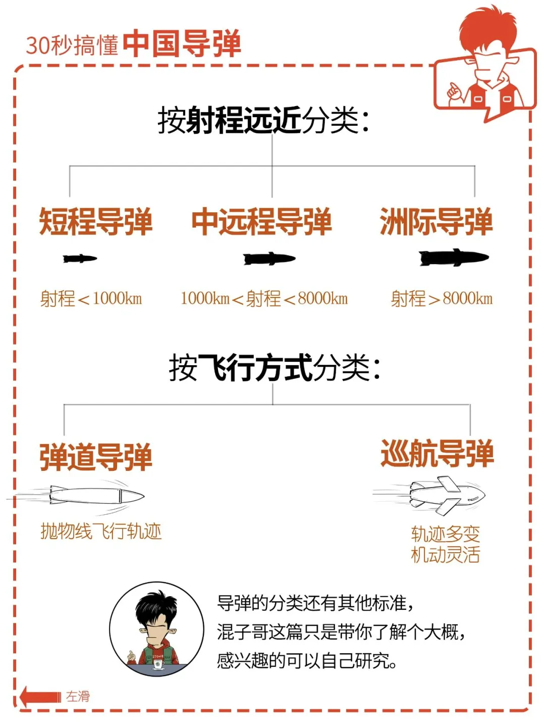 两天看阅兵的时候,各种亮眼的装备,是不是给了你亿点点震撼? 这些大国重器,展现出了我国国防科技硬核实力,其中就有多款导弹,它们被誉为“中华利剑”。 那么你有没有想过一个问题:我国的导弹家族庞大,包括很多系列,比如东风、惊雷、巨浪、鹰击、红旗……它们各自有什么作用?又有啥区别? 今天混子哥就用 30 秒,带你搞懂各种中国导弹。点击图片,看清晰大图,方便保存、转发。转载请注明出处。