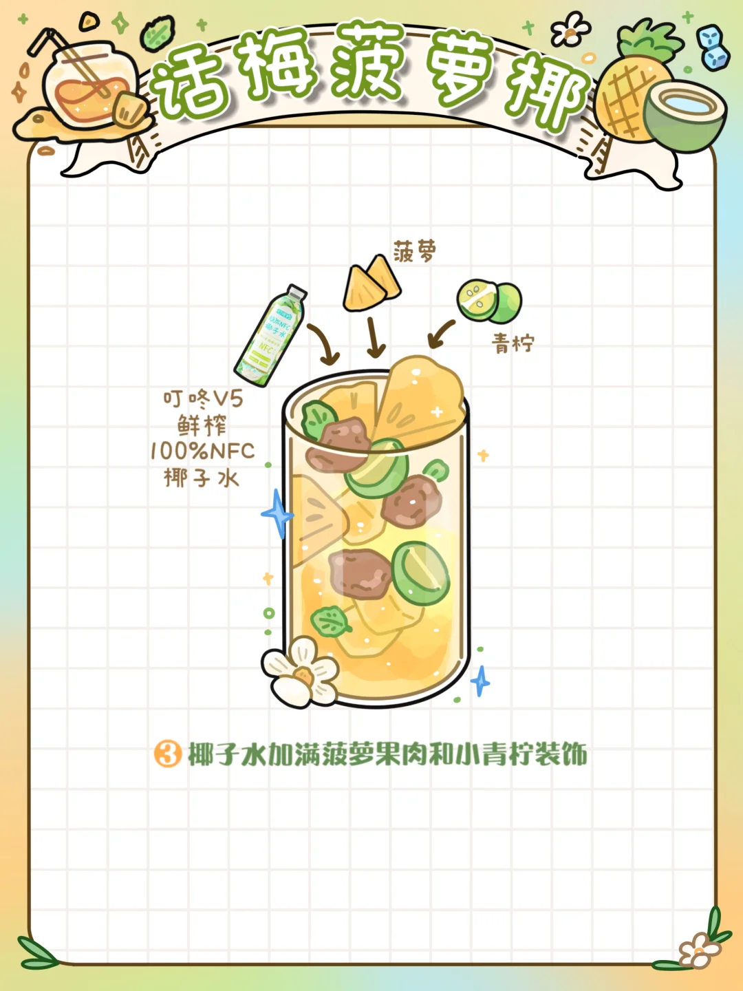 3️⃣椰子水🥥倒满,加点小青柠🍋🟩和菠萝🍍果肉装饰