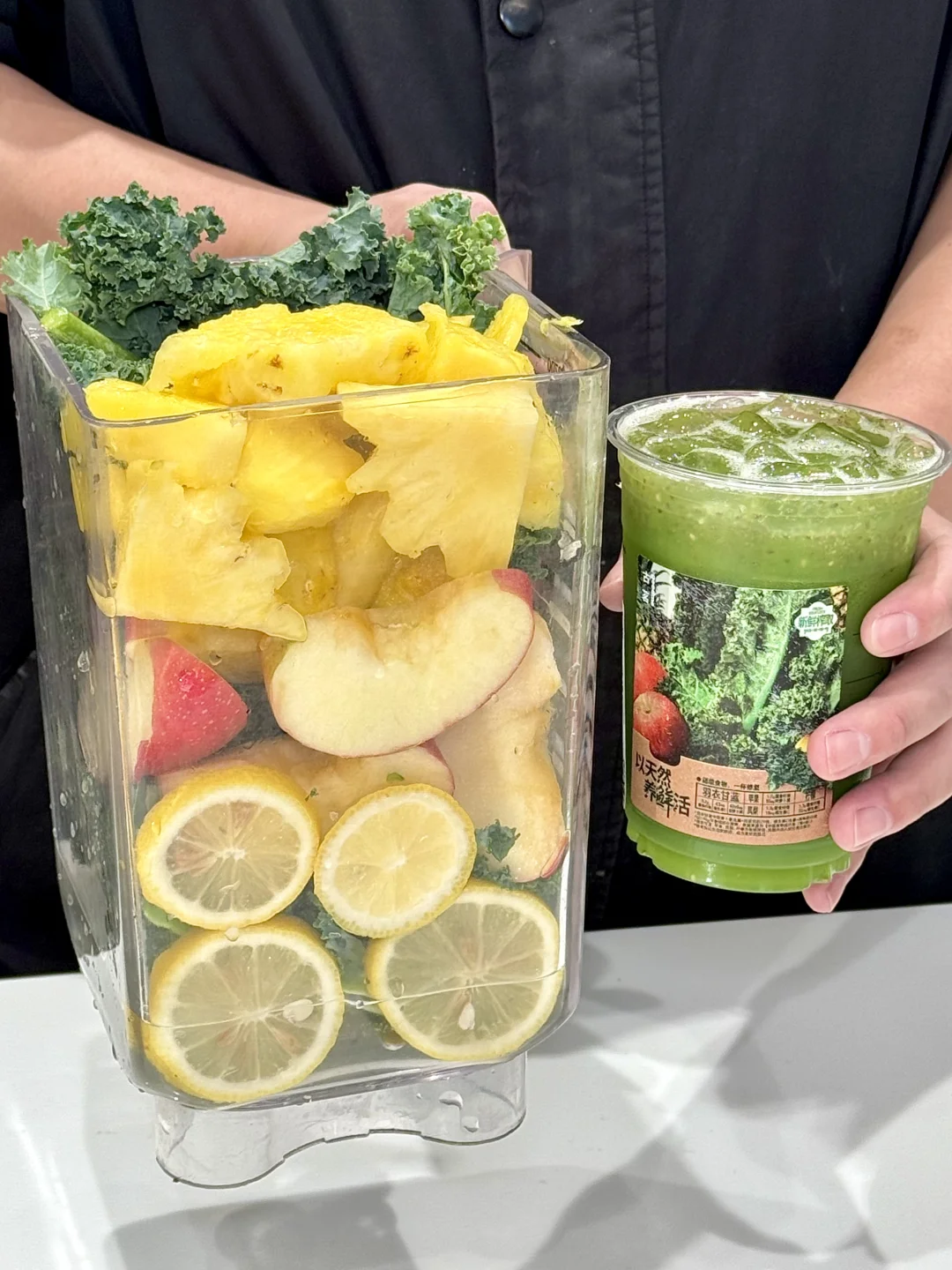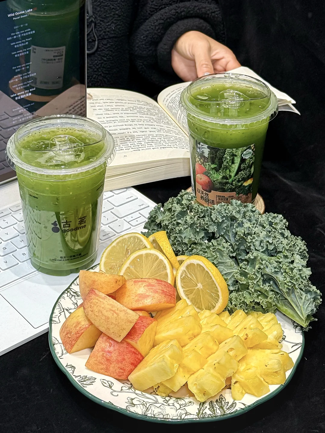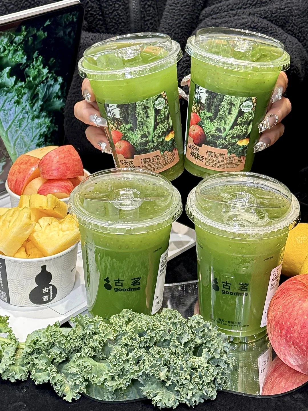 夸张!!! 给姐妹带了一杯古茗新出的轻体果蔬瓶。。 好喝到她狂发8条朋友圈!!! 一大早去就看到爆单可是店员还在切水果。。。😅😅好奇为什么不提前备好啊?她们说要求当天新鲜果蔬……好啊古茗 算你良心!!! 拿到第一时刻立马先尝,妈呀太新鲜了!! 一整杯满满的天然果蔬!!!用的是超级⻝物⽻⾐⽢蓝,搭配红富⼠苹果、凤梨🍍和⻩柠檬🍋!新鲜现榨的当日果蔬,喝起来酸酸甜甜的!加上茉莉花茶香香的贼清新!!每一口都带着奇亚籽,口感层次爆炸丰富特别解腻!!! 羽衣甘蓝+凤梨的神仙cp,喝完感觉噗噗都顺畅了,第二天肚子是扁扁的!整个人都轻盈了!!!!爱s这杯健康小绿水,我宣布入春好身材是古茗给的!!! 低卡没啥负担,每天一杯也好健康🫶🏻 终于理解姐妹说的蔬果汁好喝!!!!! 俺俩准备在夏天来临前一直喝!!小蛮腰我们来啦~