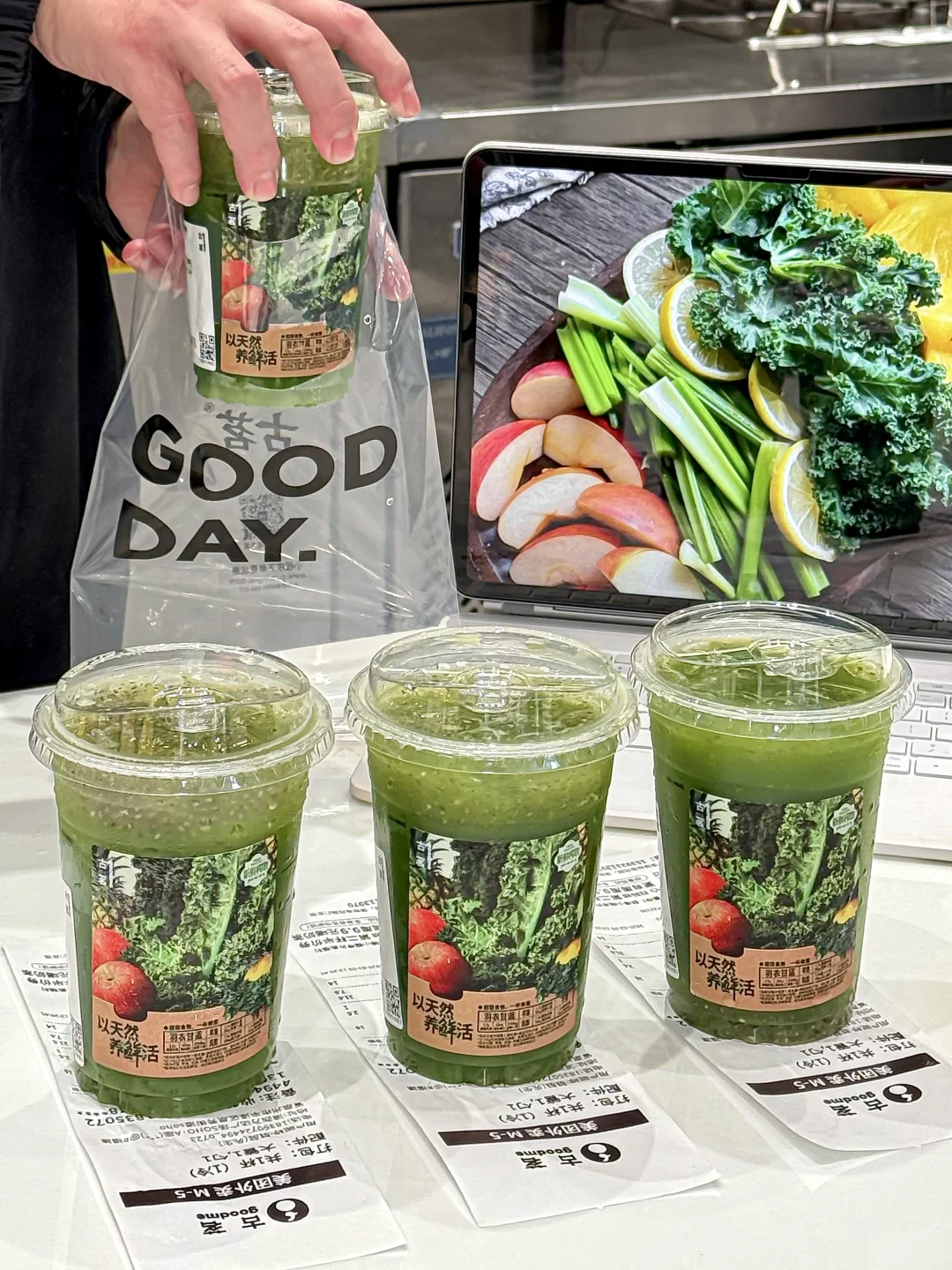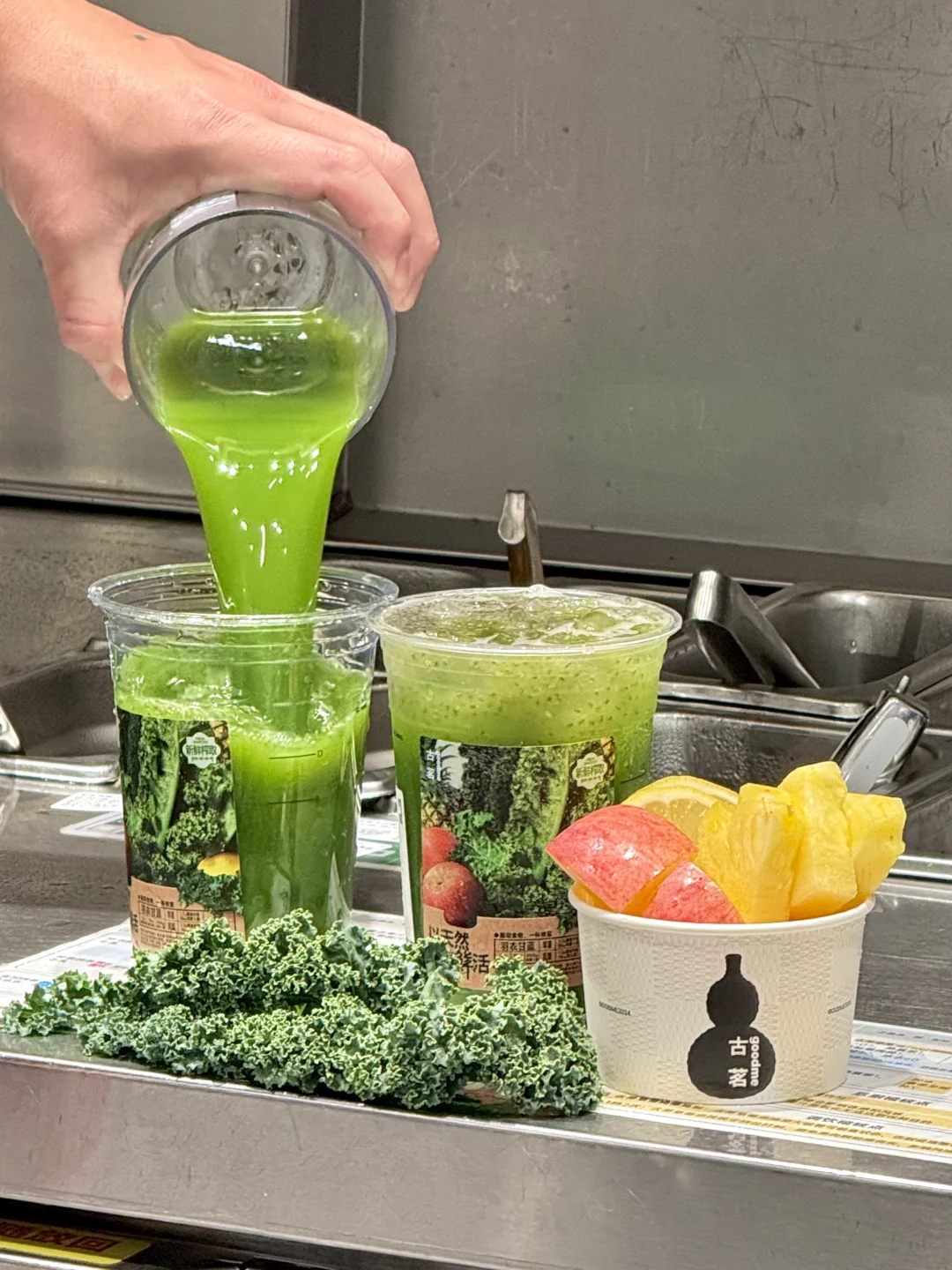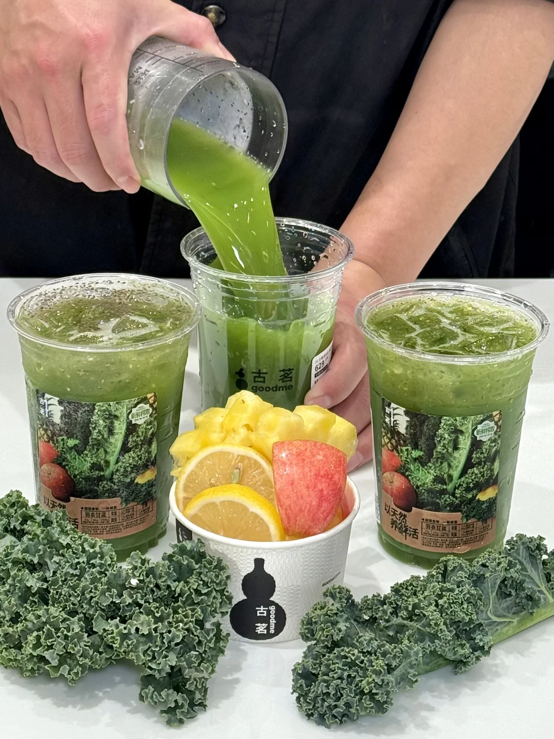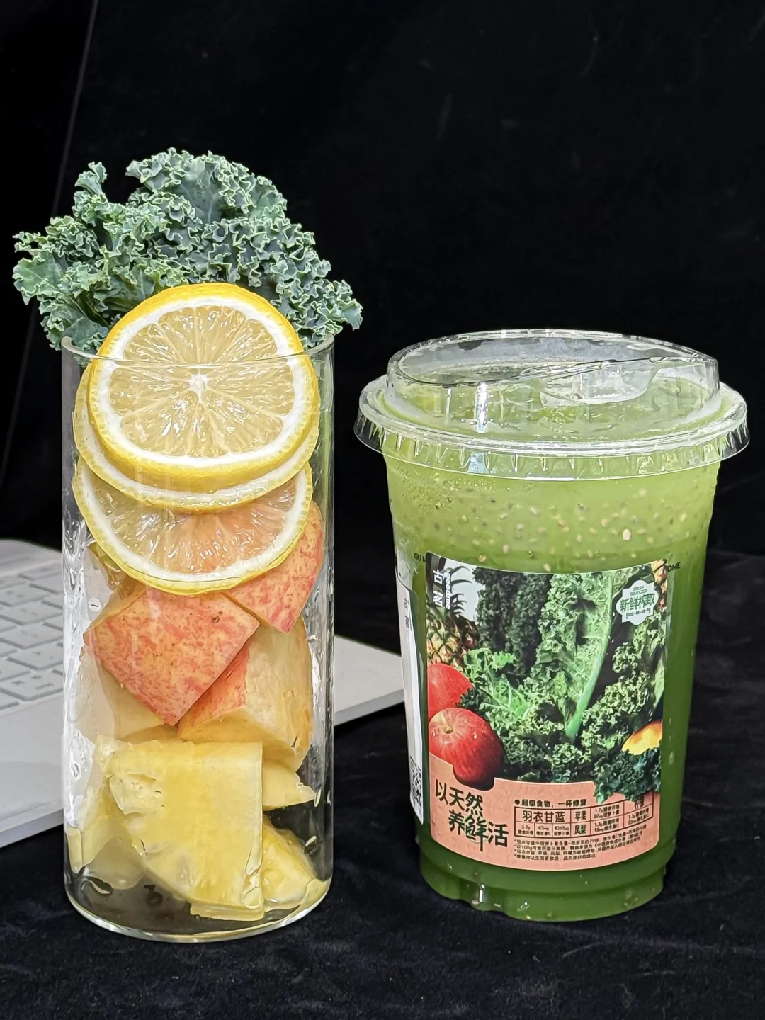 夸张!!! 给姐妹带了一杯古茗新出的轻体果蔬瓶。。 好喝到她狂发8条朋友圈!!! 一大早去就看到爆单可是店员还在切水果。。。😅😅好奇为什么不提前备好啊?她们说要求当天新鲜果蔬……好啊古茗 算你良心!!! 拿到第一时刻立马先尝,妈呀太新鲜了!! 一整杯满满的天然果蔬!!!用的是超级⻝物⽻⾐⽢蓝,搭配红富⼠苹果、凤梨🍍和⻩柠檬🍋!新鲜现榨的当日果蔬,喝起来酸酸甜甜的!加上茉莉花茶香香的贼清新!!每一口都带着奇亚籽,口感层次爆炸丰富特别解腻!!! 羽衣甘蓝+凤梨的神仙cp,喝完感觉噗噗都顺畅了,第二天肚子是扁扁的!整个人都轻盈了!!!!爱s这杯健康小绿水,我宣布入春好身材是古茗给的!!! 低卡没啥负担,每天一杯也好健康🫶🏻 终于理解姐妹说的蔬果汁好喝!!!!! 俺俩准备在夏天来临前一直喝!!小蛮腰我们来啦~