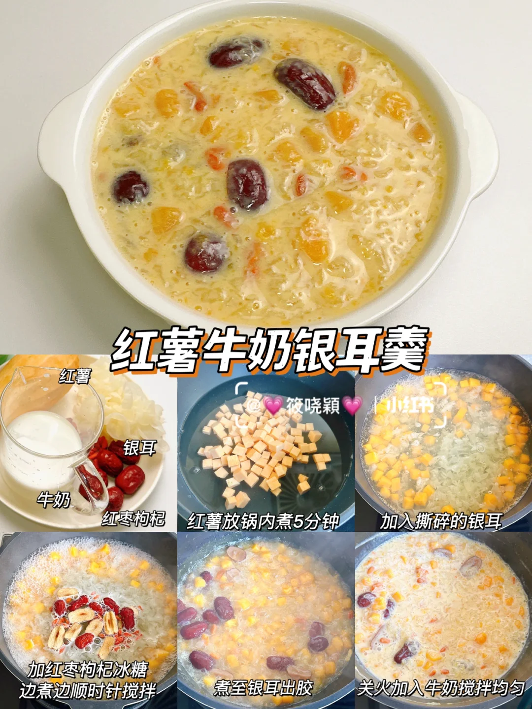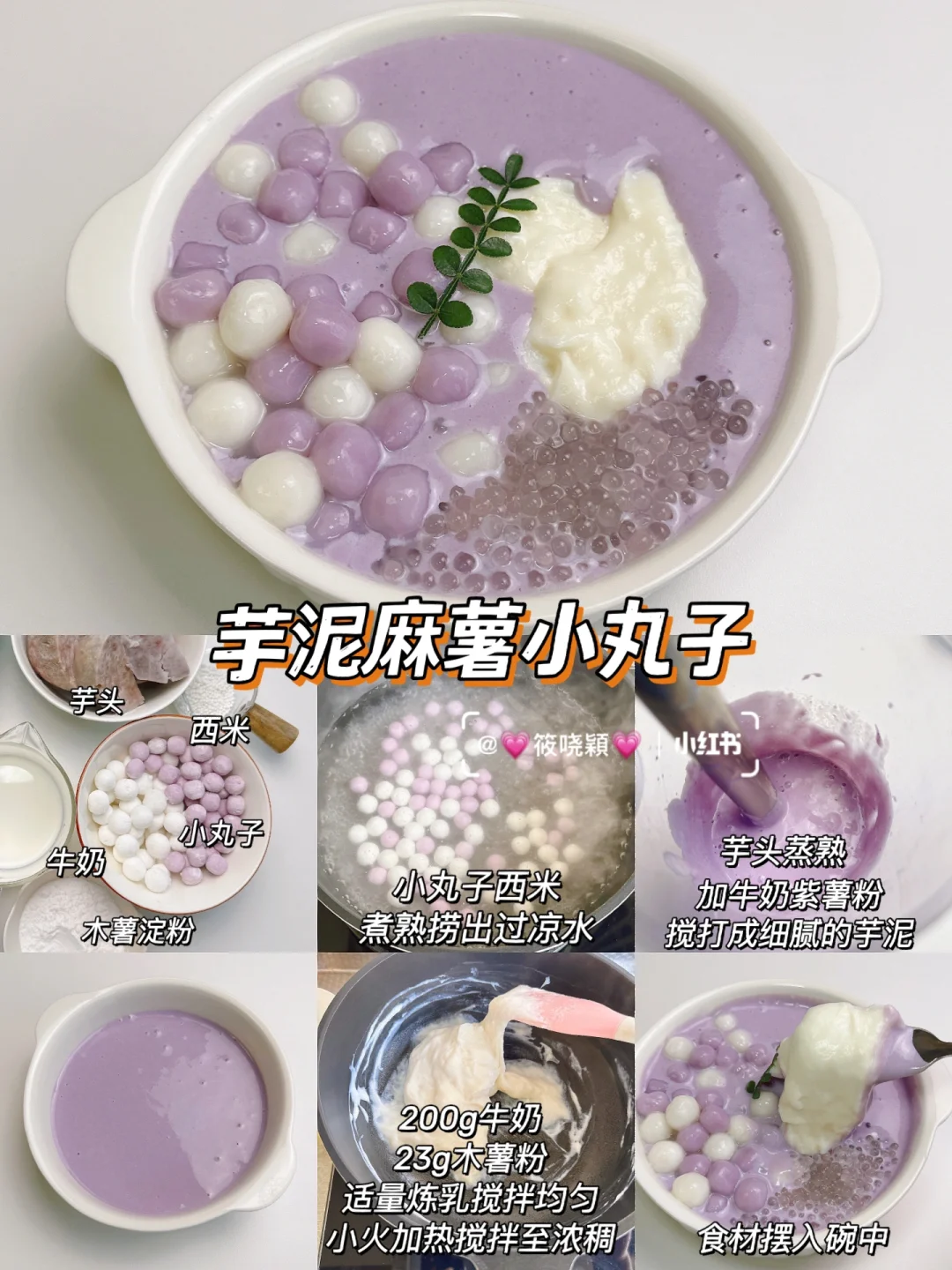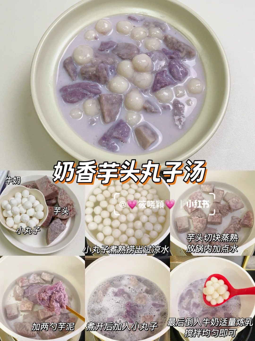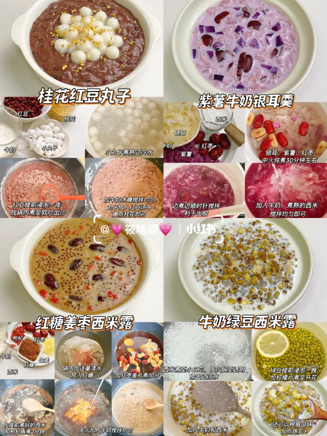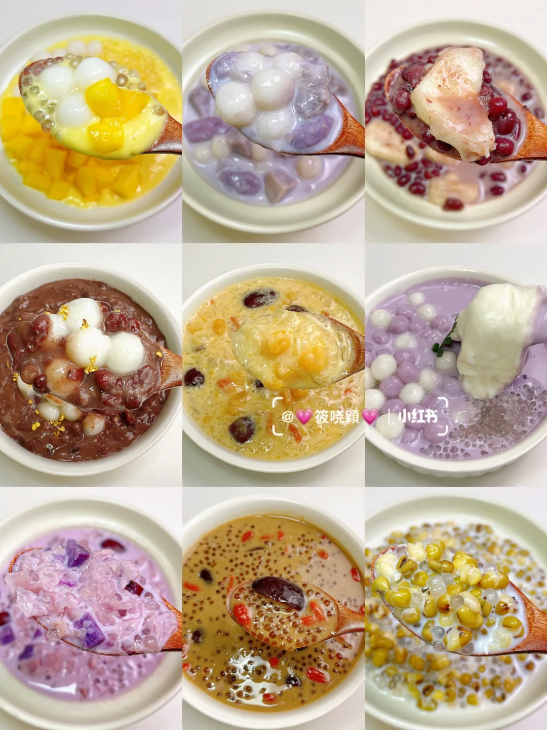 养生女孩看这里❗️分享几款超适合秋冬喝的养生甜汤! 软软糯糯,暖胃暖身,每一款都巨好喝,低卡不易胖,一起来试试吧~ . 1⃣️多芒小丸子 2⃣️奶香芋头丸子汤 3⃣️牛奶红豆年糕汤 4⃣️桂花红豆丸子 5⃣️红薯牛奶银耳羹 6⃣️芋泥麻薯小丸子 7⃣️紫薯牛奶银耳羹 8⃣️红糖姜枣西米露 9⃣️牛奶绿豆西米露 🌈每一款的具体做法请翻看图片噢~