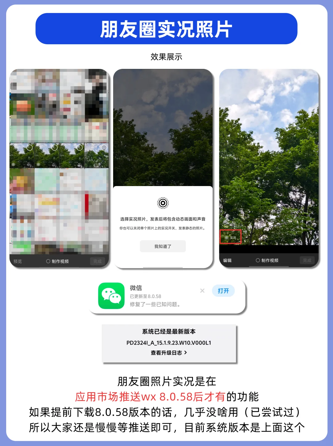 目前朋友圈照片确实得慢慢等待,要等待应用市场推送wx8. .58版本后才可以正常使用实况照片,其他方法几乎没啥用(已尝试)