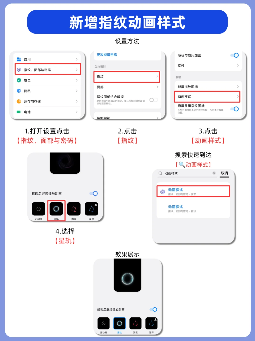 [一R]具体路径:打开设置点击【指纹、面部与密码】-点击【指纹】-点击【动画样式】-选择【新轨】