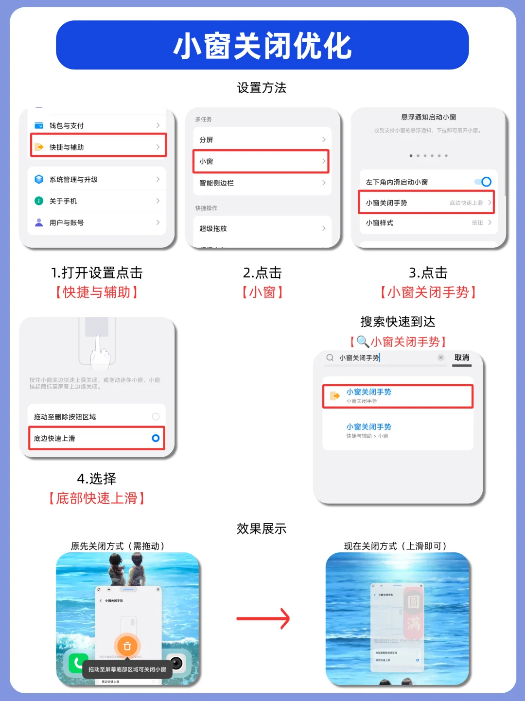 [一R]具体路径:打开设置点击【快捷与辅助】-点击【小窗】-点击【小窗关闭手势】-选择【底部快速上滑】