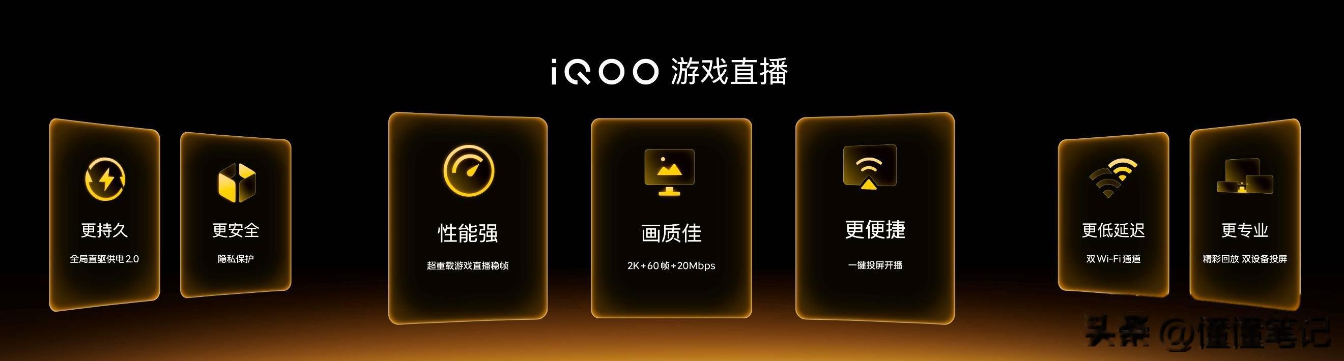 iQOO 15 的游戏直播助手全面升级,支持最高 2K+60帧+20Mbps 以上的超高清游戏投屏直播,并持续与抖音深度合作,行业首发“一键投屏开播”,两步即开播;支持原生 144帧+极致画质直播,超高负载下的表现更强悍;高光时刻自动录制,自动记录用户每个游戏高光时刻。