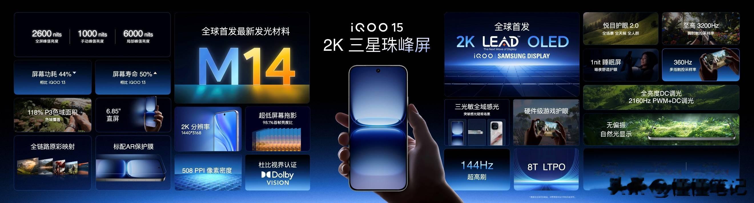 “跨代领先”iQOO 15 传承 iQOO 手机在实力和口碑的双重表现,搭载由第五代骁龙 8 至尊版领衔的“至尊性能组合”完全体,实现行业领先的性能表现,并在自研电竞芯片 Q3 和 Monster 超核引擎的支撑下,带来“全场景光线追踪+ 2K 原画超分+144FPS 无损超帧”,共筑行业领先游戏视效生态;更以全新演绎的国潮设计、超级潜望长焦以及更流畅智慧的 OriginOS 6等一系列强悍配置,打造一款“性能超长板,全面无短板”的未来性能旗舰。