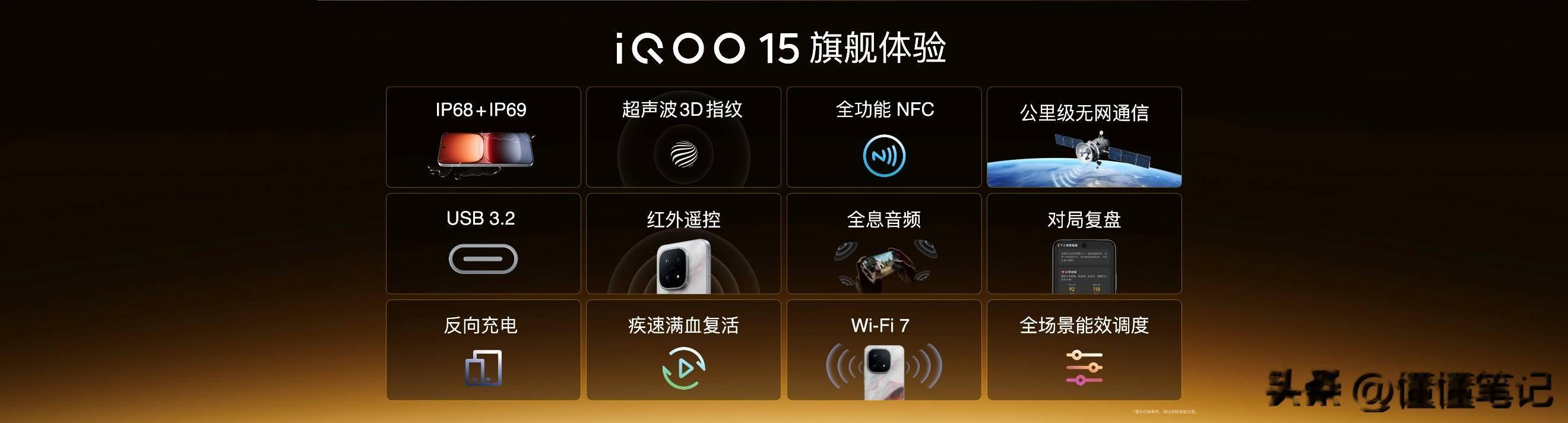 全面无短板,iQOO 15 搭载全新一代超声波 3D 指纹、IP68IP69 防尘防水、Wi-Fi7、全功能 NFC、UWB车钥匙、公里级无网通信和红外遥控等,一步到位,全部顶满。