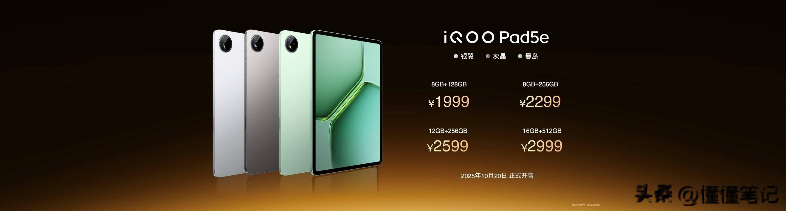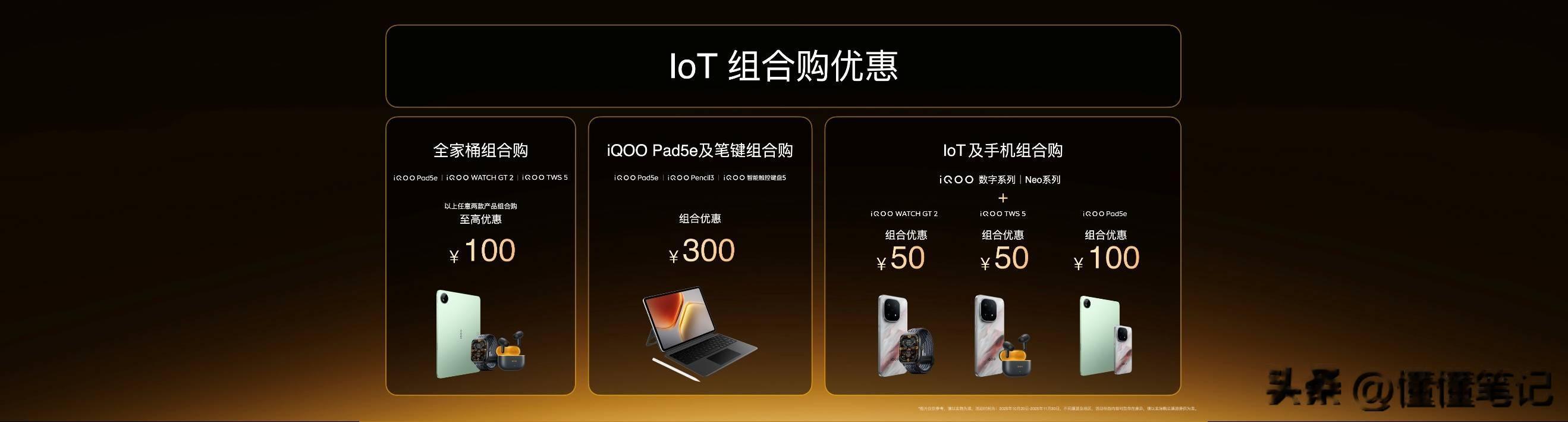 iQOO Pad5e、iQOO WATCH GT 2 和 iQOO TWS 5 的售价分别是 1999 元起、499 元起和 399 元,组合购买更优惠。