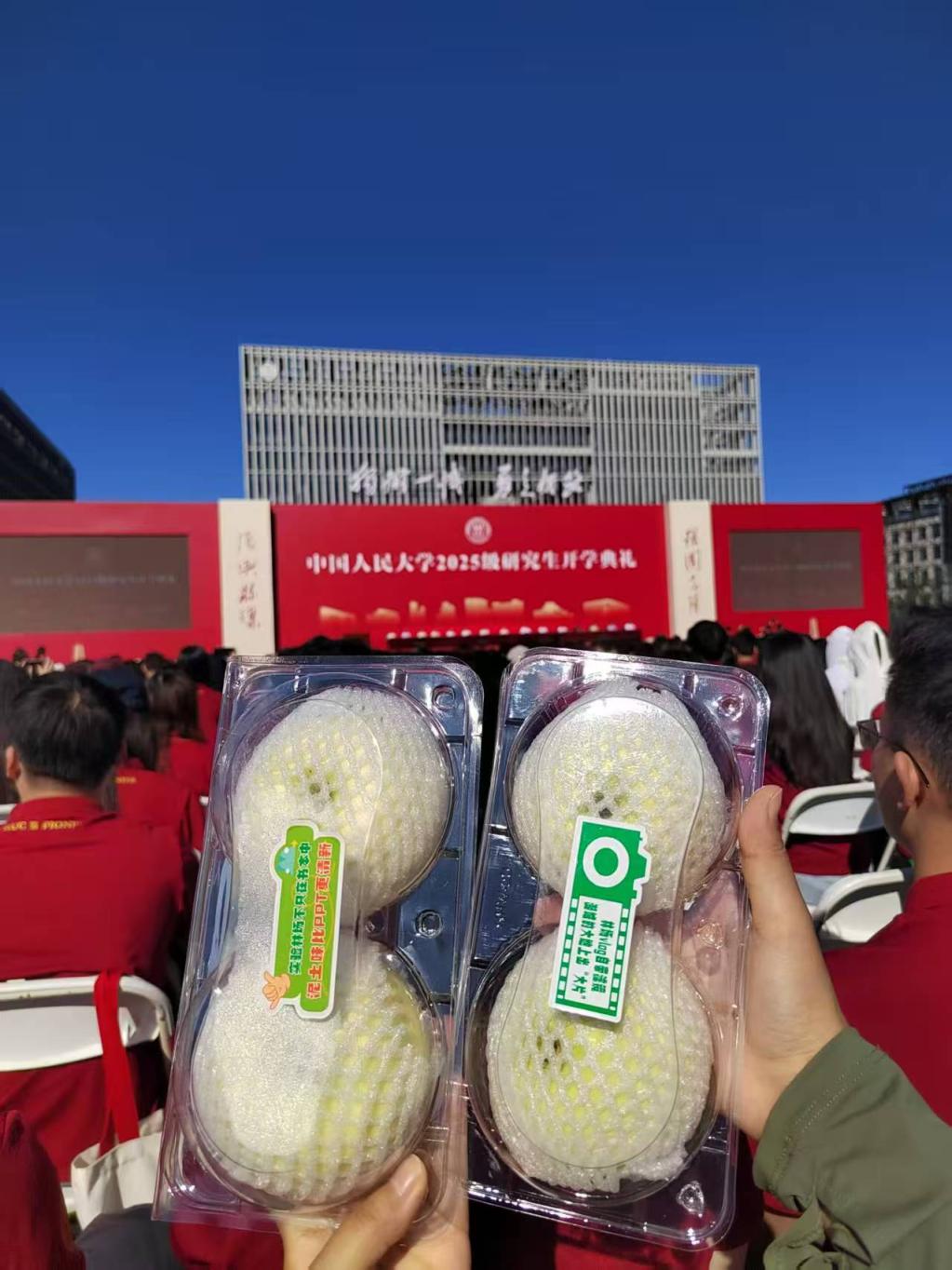 9月6日上午,中国人民大学2025级研究生开学典礼在北京通州校区西运动场举行。新生们惊喜地发现,通州校区所在地潞城镇,为他们准备了开学礼物——除了潞城镇手绘地图,还有集体林场苹果、手作小红花胸针。