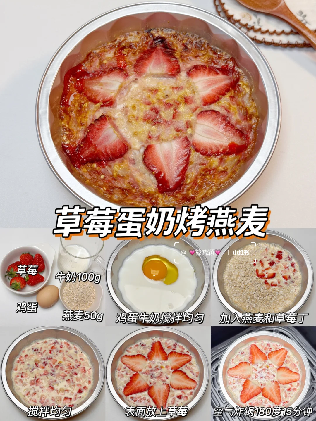 ✅鸡蛋牛奶搅匀,加入燕麦片和草莓丁搅匀,铺上对半切的草莓,空气炸锅180度 15分钟