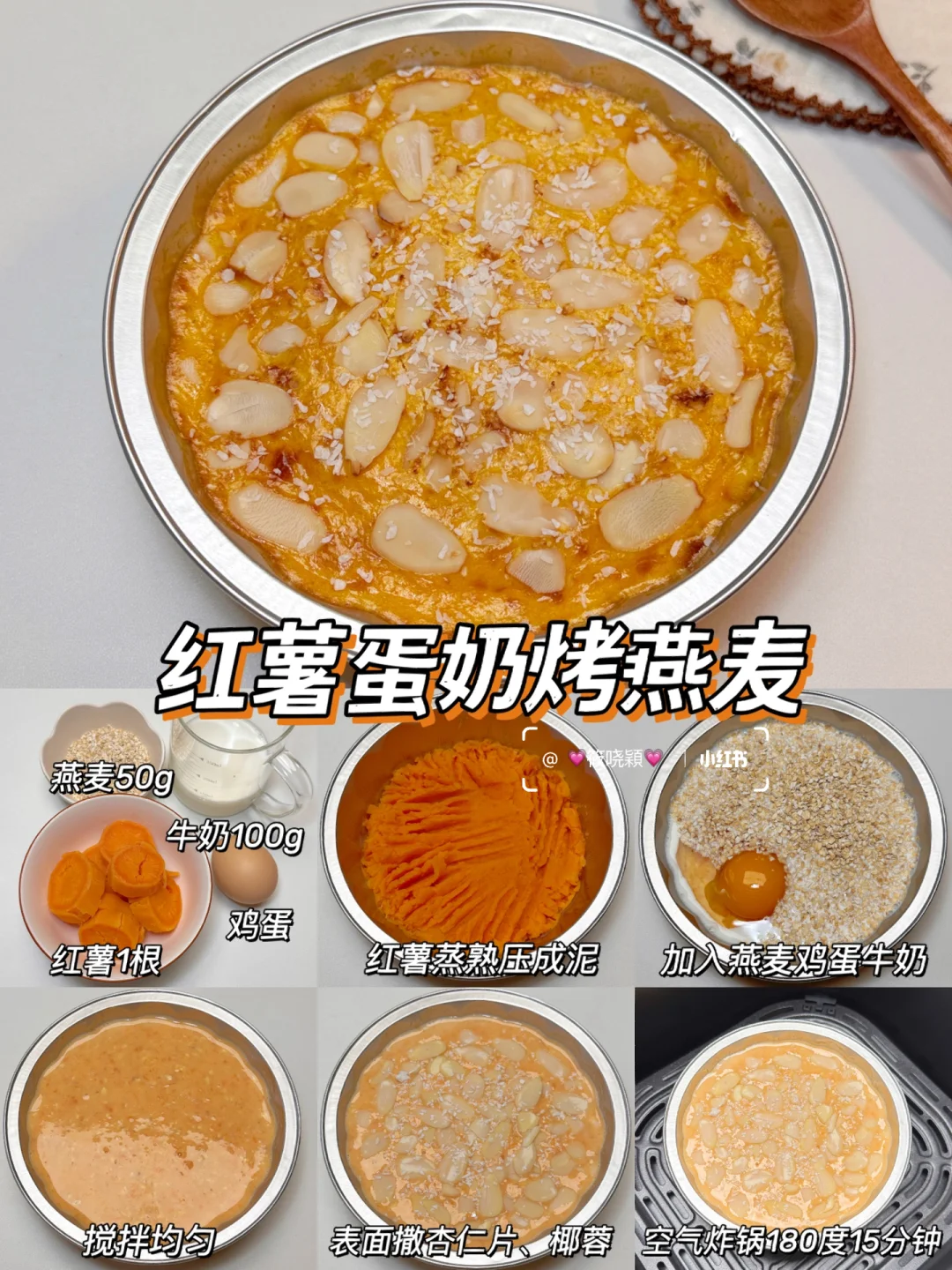 ✅红薯蒸熟压成泥,加入牛奶鸡蛋燕麦片搅匀,表面撒杏仁片和椰蓉,空气炸锅180度 15分钟