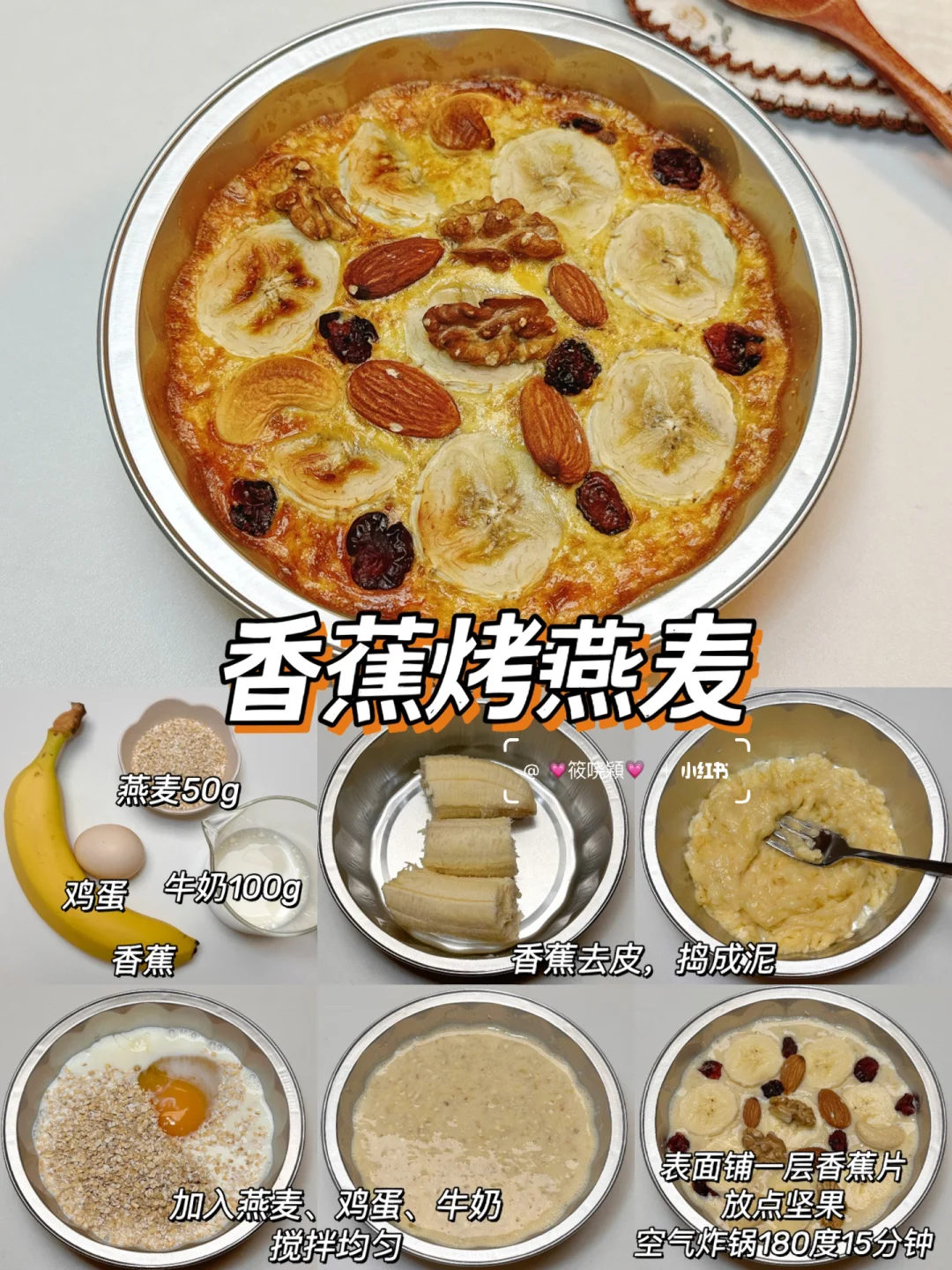 ✅1根香蕉压成泥,加入燕麦鸡蛋牛奶搅匀,放上香蕉片和坚果,空气炸锅180度 15分钟