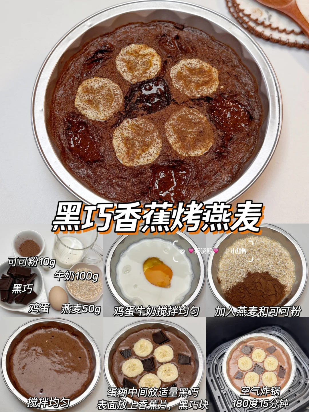 ✅鸡蛋牛奶搅匀,加入可可粉和燕麦片搅匀,倒入碗中中间加入黑巧,表面摆上香蕉片和黑巧,空气炸锅180度 15分钟