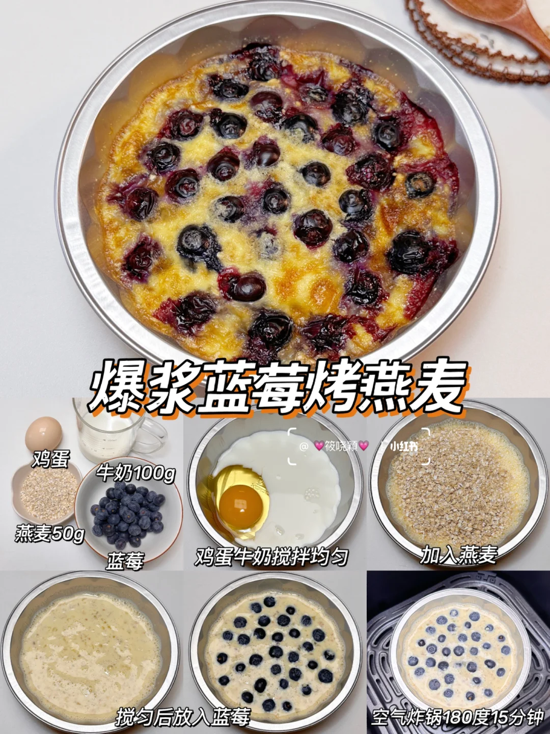 ✅牛奶鸡蛋搅拌均匀,加入燕麦片搅匀,放入蓝莓,空气炸锅180度 15分钟