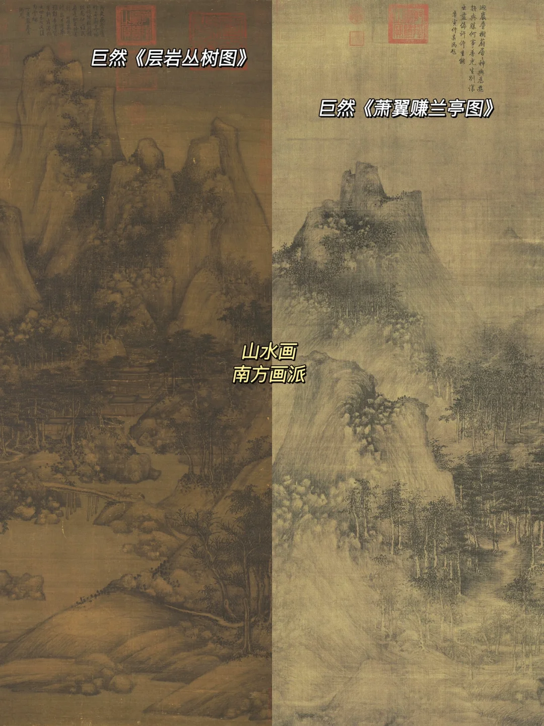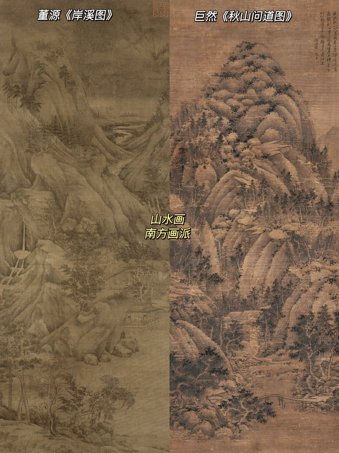 ✨巨然师承董源,但受到了北方山水画的影响,因此在他的《秋山问道图》中,我们可以看到山更高大,树更葱郁,只有水还保持着清润烟岚之感。