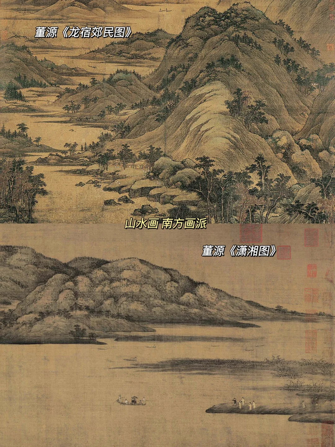 与北方清晰透彻不同,南方画派更为平淡天真,烟波浩渺。✨董源常将披麻皴和苔点相结合,点子皴的画法也最先出现在他的画中,用来展现山水秀色的江南风光。