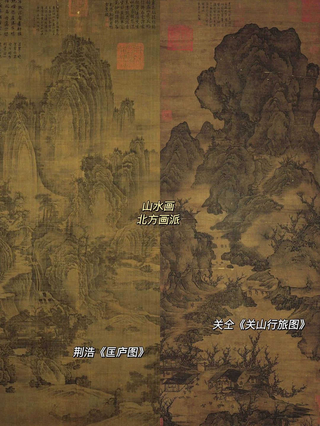 北方画派以✨荆浩、✨关仝为代表。荆浩开创了大山大水的雄奇风格。他善用勾皴水墨,着眼广阔空间,将层峦叠嶂、飞流直下、扁舟独行的动静结合,浑然一体,体现于《匡庐图》中。