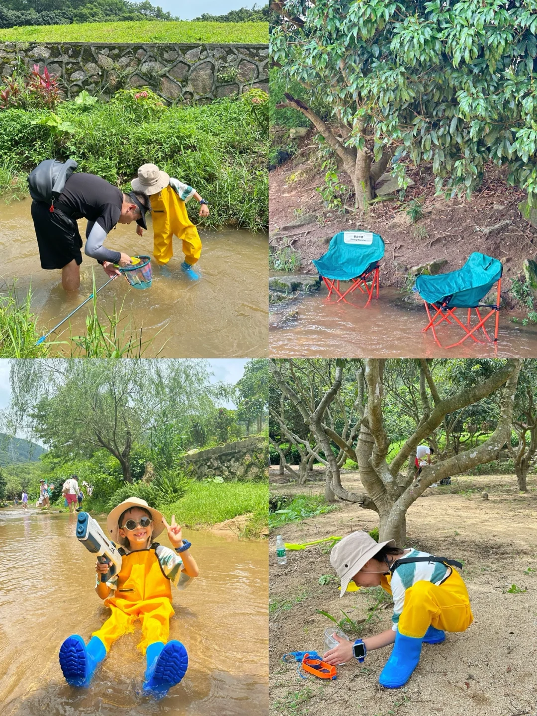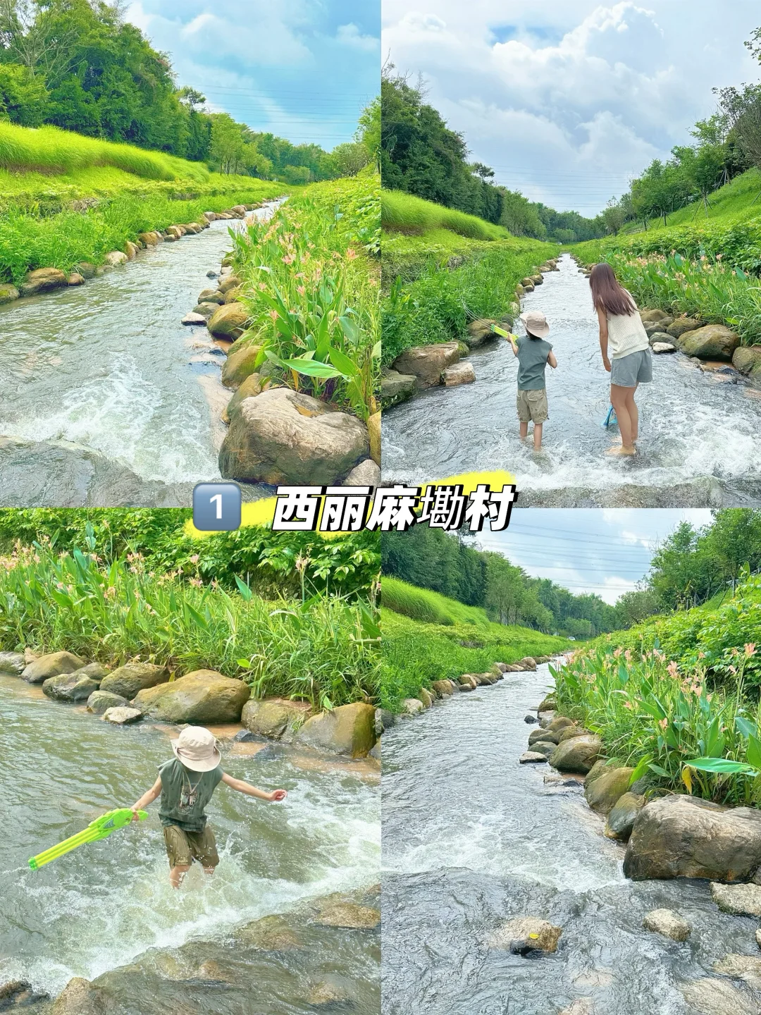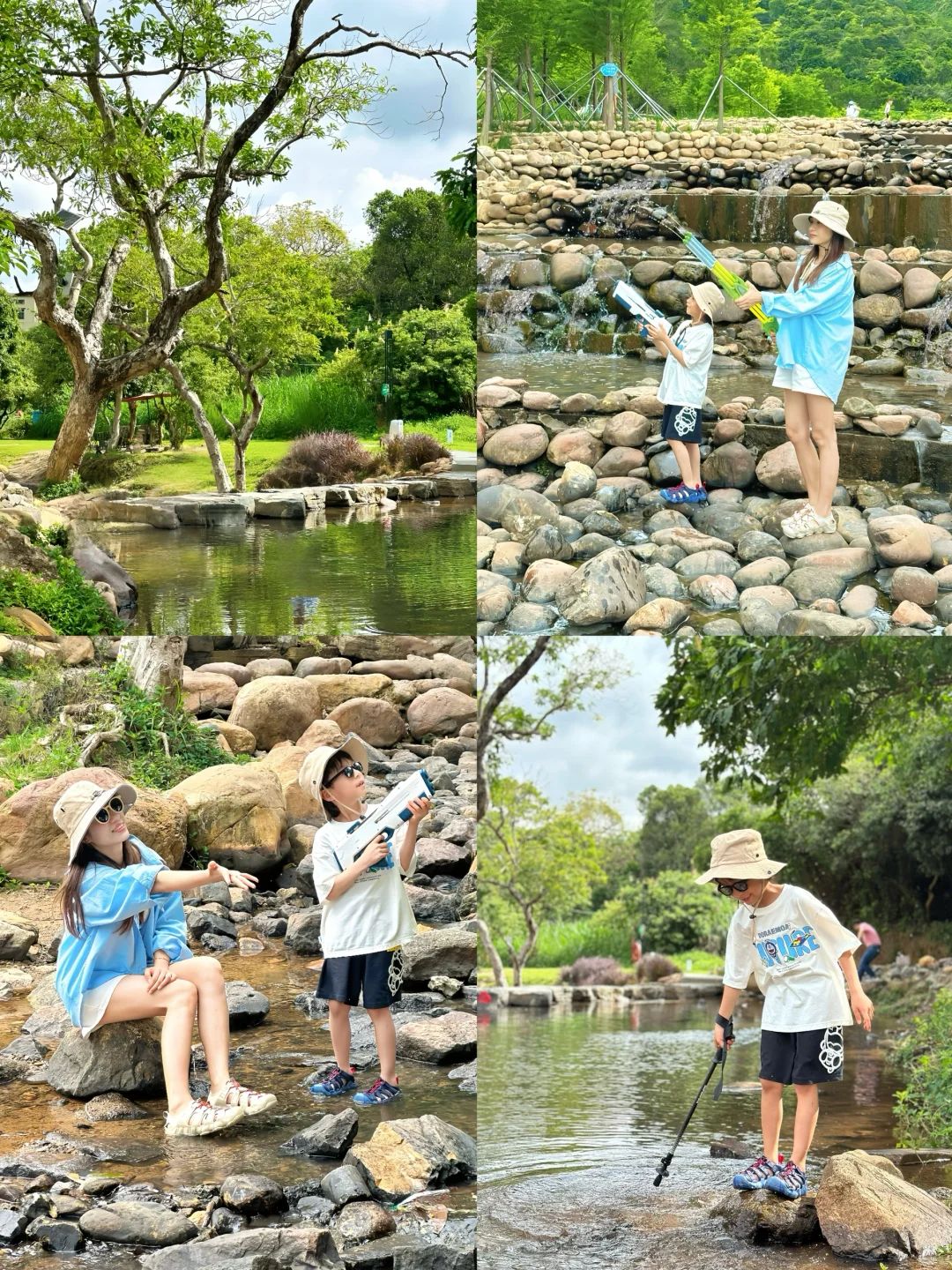 公园玩水的地方分了好几段,上游可以直接扎在水里玩耍,下游可以带上渔网捞鱼