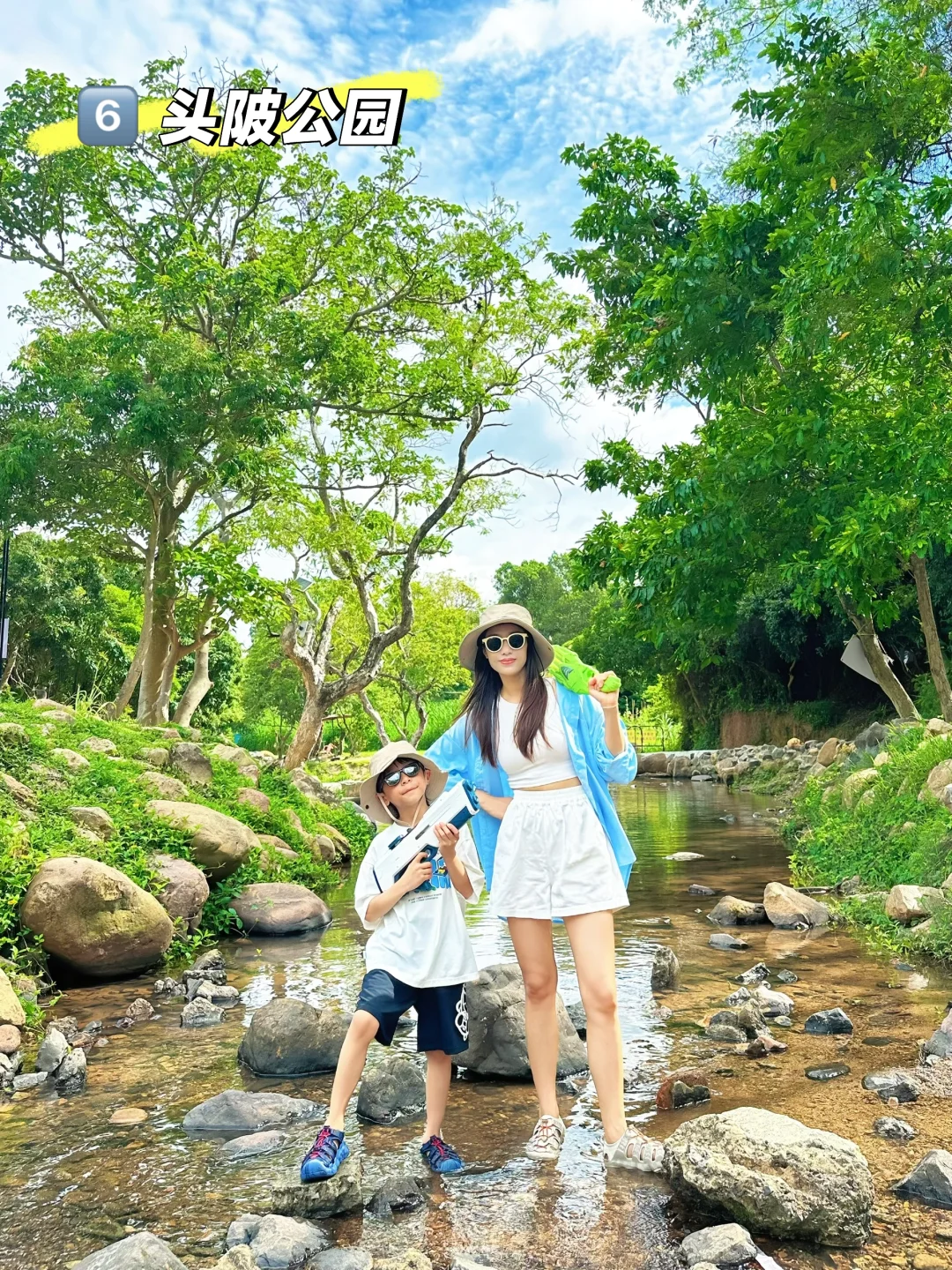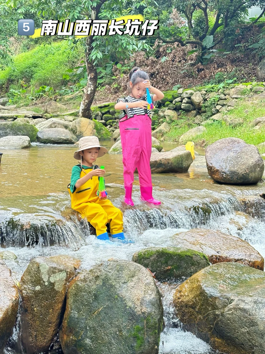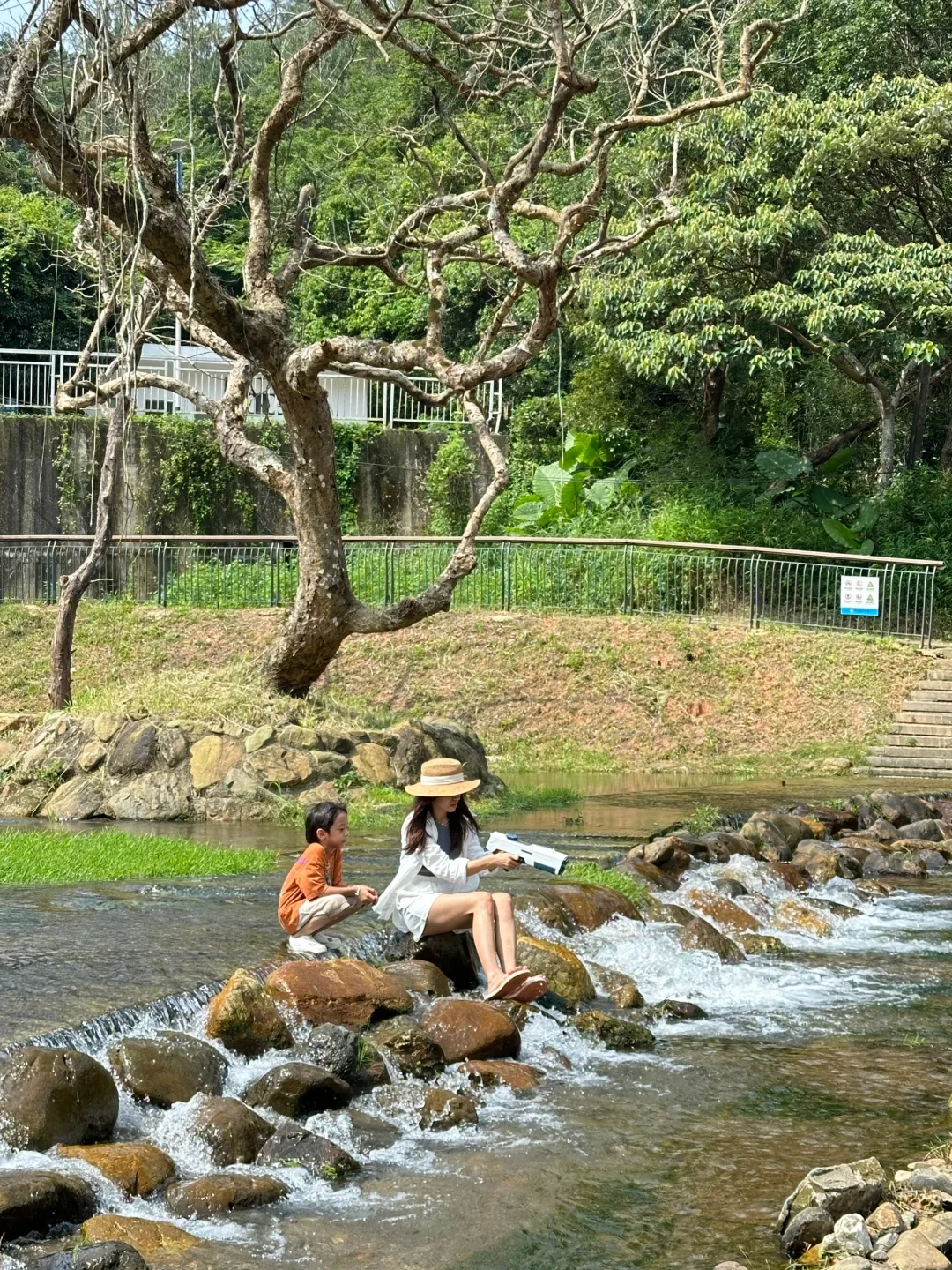 公园玩水的地方分了好几段,上游可以直接扎在水里玩耍,下游可以带上渔网捞鱼